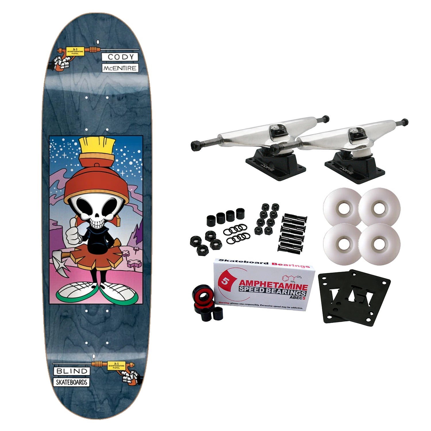 Resin 7 Construction. 7-ply 100% North America Maple with Epoxy Resin Glue. Individually Pressed. Stronger than industry standard 7-ply. Strong pop. Long deck life. Measures 9.0" x 32". Comes with Core trucks, 58mm 97A wheels, Amp abec 5 bearings, Black Diamond Griptape, risers, and hardware. Core trucks are light weight and feature heavy duty aluminum with grade 8 steel kingpins and axles, as well as USA made bushings and pivot cups. 58mm 97A are the perfect wheels for both street and park skating. Like the name states, Amp bearings are stimulants for your wheels! Light synthetic oil, Delrin Crowns, and Rubber Serviceable Shields are a few of the things that makes these bearings one of the best Abec 5 rated bearings on the market. Arrives un-assembled which allows for customization and a feeling of accomplishment. Skaters love building their boards! Easy to assemble!