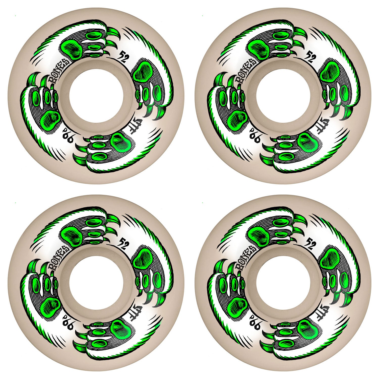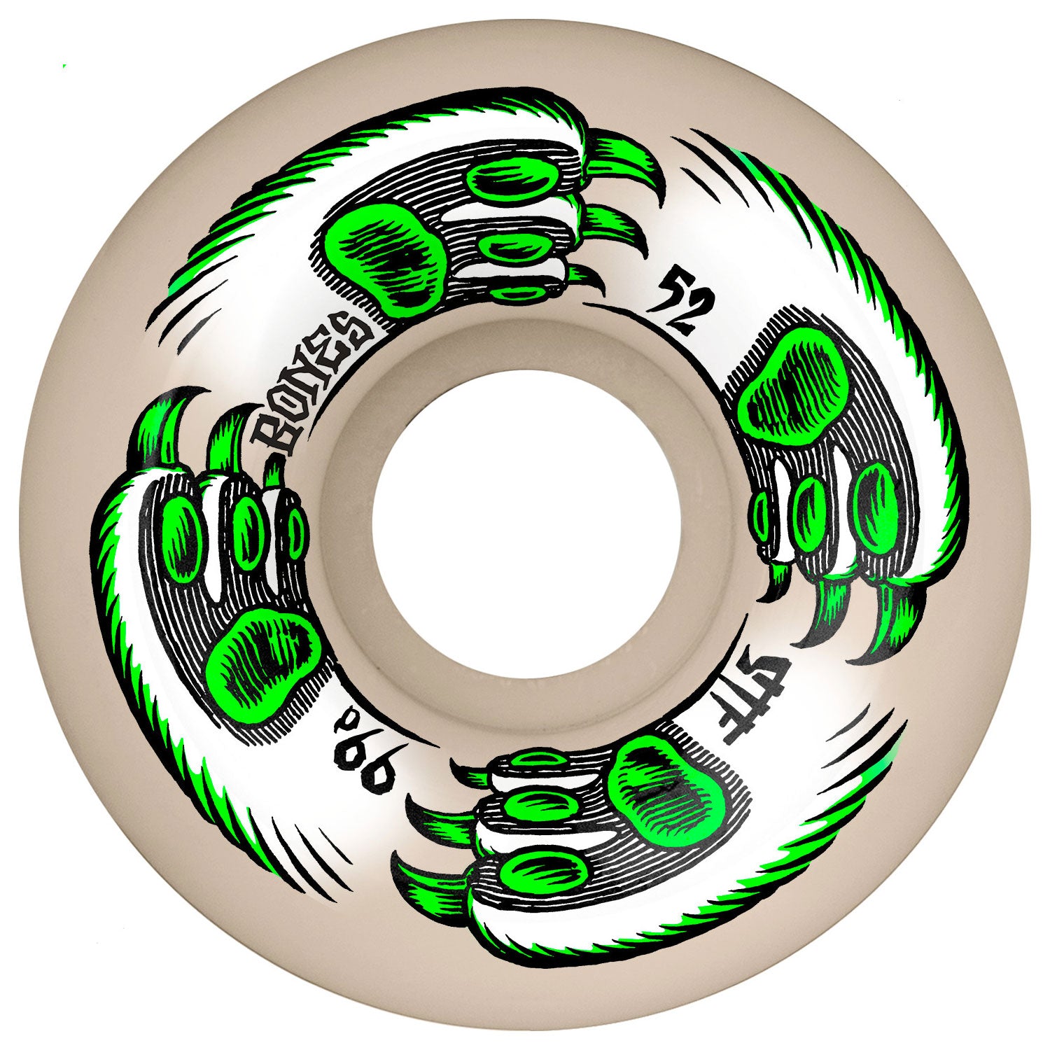 Bones Street Tech Formula 99A wheels in the V5 Sidecut shape. This shape is tuned for skating ledges, rails and bowls, featuring a centerset reversible bearing seat. This shape is versatile, lighter weight, less slide drag, faster longer grinds, high resistance to flatspots, graphic protection.