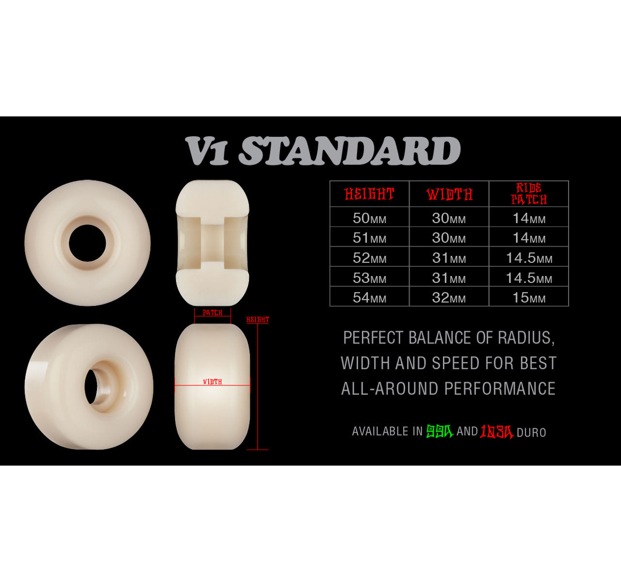 Bones Street Tech Formula 99A wheels in the V1 Standard shape. This shape is a classic street shape, featuring a centerset reversible bearing seat. This shape is versatile, stable, and durable. The best all around performance shape.