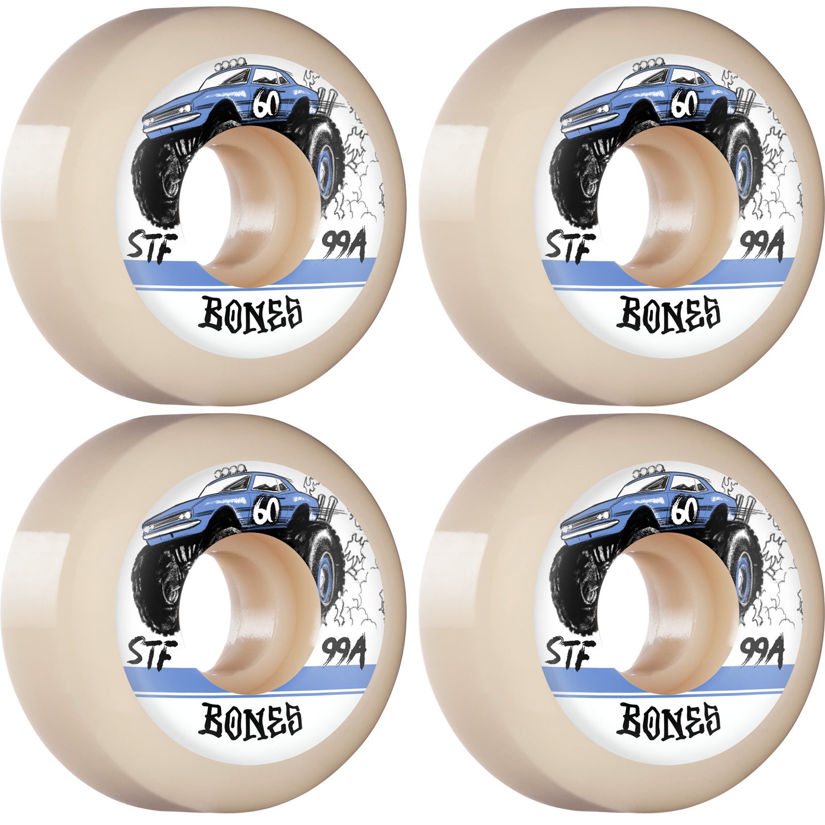 These Bones wheels feature the V5 Sidecut shape. 60mm x 34mm, 99A. Bones Street Tech Formula powers the legendary Bones STF wheels that roll fast, grip when you need to and slide when you want to, without flat spotting. STF gives you more control to skate with confidence. Bones STF wheels outperform all other wheels, and because they wear so well, they last several times longer than normal wheels, making STF wheels the best for less.