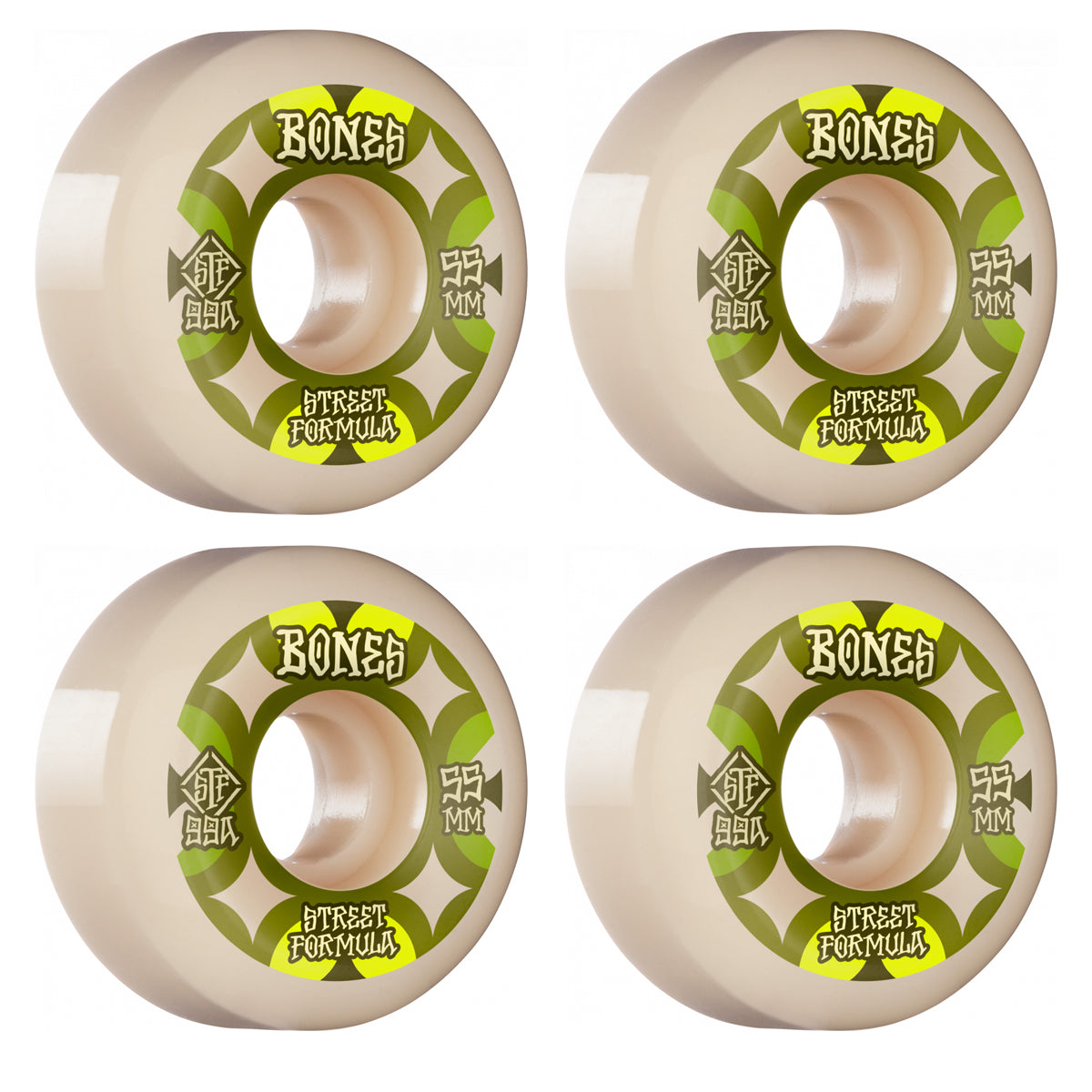 These Bones wheels feature the V5 Sidecut shape. 55mm x 32mm, 99A. Bones Street Tech Formula powers the legendary Bones STF wheels that roll fast, grip when you need to and slide when you want to, without flat spotting. STF gives you more control to skate with confidence. Bones STF wheels outperform all other wheels, and because they wear so well, they last several times longer than normal wheels, making STF wheels the best for less.