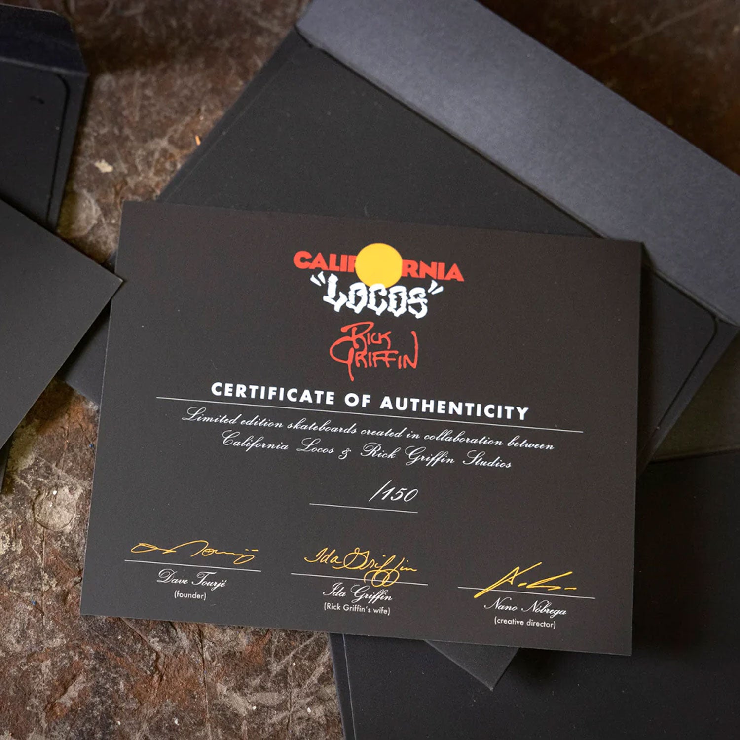 The limited collection with the legendary artist Rick Griffin features high-performance street decks that can either be hung on the wall as a piece of collectible art or taken to a skatepark to shred like a pro. These boards are numbered, built using North American hardrock maple, an extra bond glue and it comes in custom art boxes that include a certificate of authenticity and the SK8OLOGY wall mount to easily display your board as a limited edition masterpiece in your home. Size: 8.25" | 32" | WB: 14.25". Comes with a custom skateboard box featuring original artwork from Rick Griffin, which can easily be framed and turned into a piece of art on your wall.