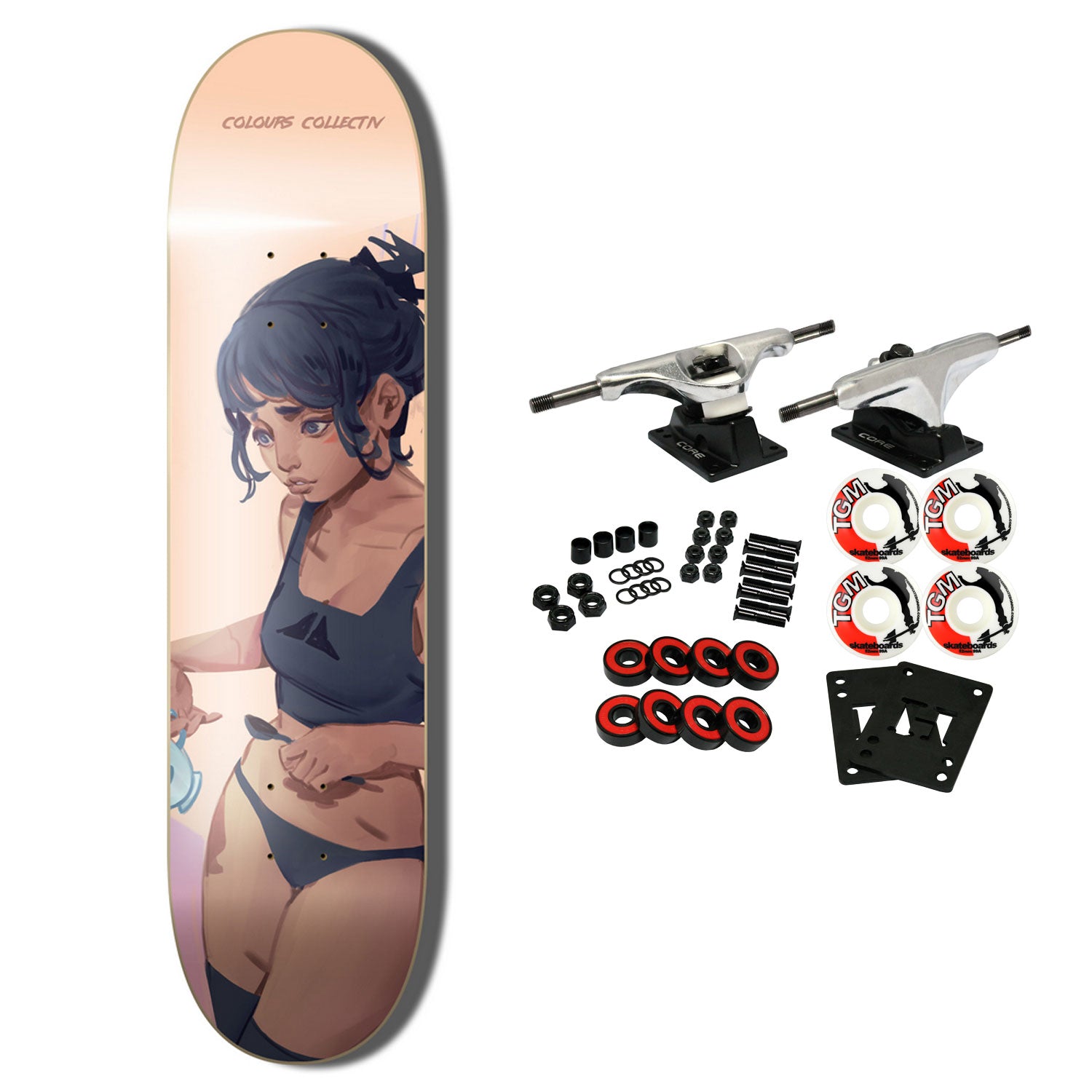 Colours Collectiv Decks are Premium 7 ply north american maple deck. Produced using the hardest epoxy for max stiffness and pop and comes with a Mellow concave. Colours Collectiv Deck 2D Panda Cheryl measures 8.25" x 32". Comes with Core trucks, 52mm TGM logo wheels, Amp abec 5 bearings, Black Diamond Griptape, risers, and hardware. Core trucks are light weight and feature heavy duty aluminum with grade 8 steel kingpins and axles, as well as USA made bushings and pivot cups. 52mm 99A are the perfect wheels for both street and park skating. Like the name states, Amp bearings are stimulants for your wheels! Light synthetic oil, Delrin Crowns, and Rubber Serviceable Shields are a few of the things that makes these bearings one of the best Abec 5 rated bearings on the market. Arrives un-assembled which allows for customization and a feeling of accomplishment. Skaters love building their boards! Easy to assemble!