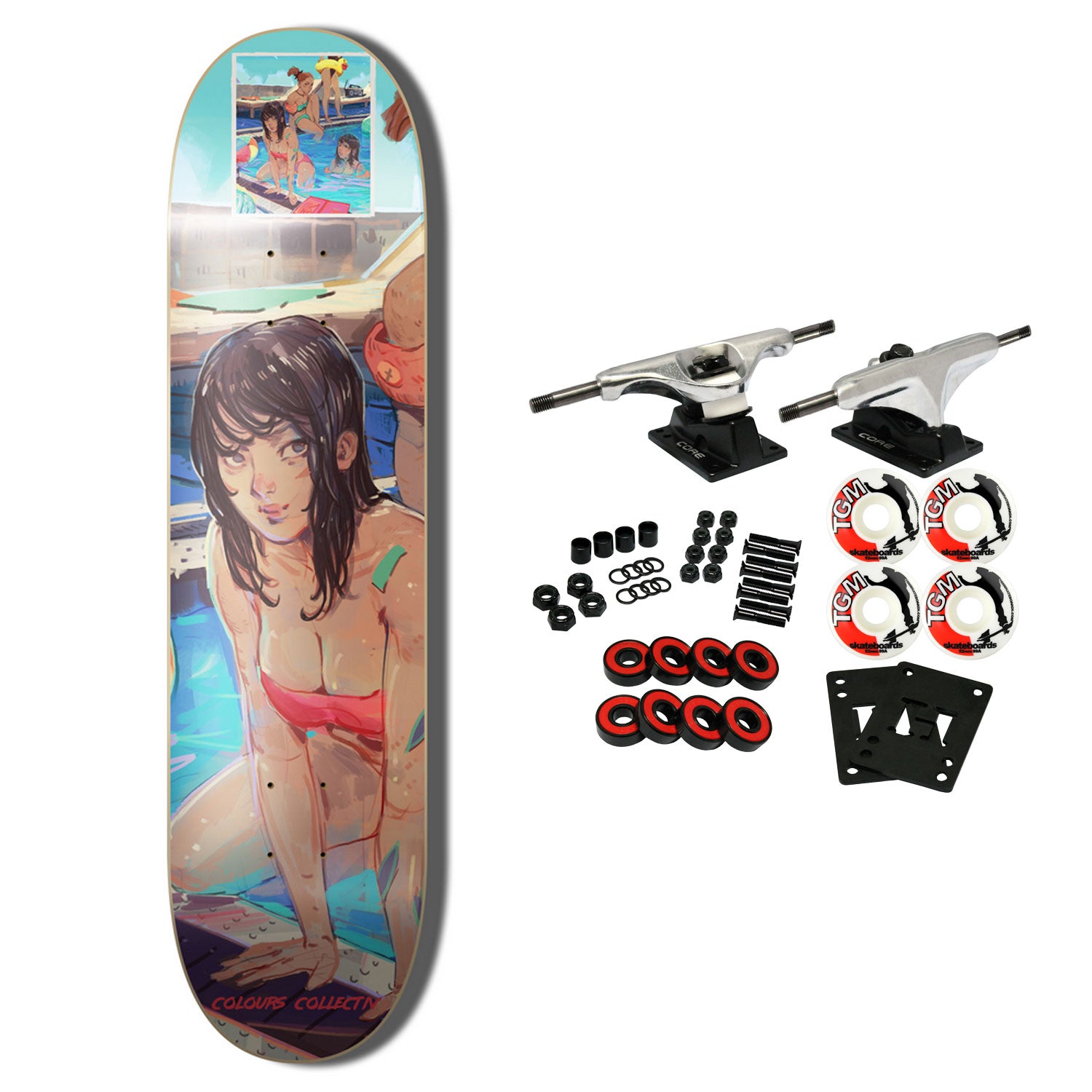 Colours Collectiv Decks are Premium 7 ply north american maple deck. Produced using the hardest epoxy for max stiffness and pop and comes with a Mellow concave. Colours Collectiv Deck 2D Panda Rachel measures 8.2" x 31.5" . Comes with Core trucks, 52mm TGM logo wheels, Amp abec 5 bearings, Black Diamond Griptape, risers, and hardware. Core trucks are light weight and feature heavy duty aluminum with grade 8 steel kingpins and axles, as well as USA made bushings and pivot cups. 52mm 99A are the perfect wheels for both street and park skating. Like the name states, Amp bearings are stimulants for your wheels! Light synthetic oil, Delrin Crowns, and Rubber Serviceable Shields are a few of the things that makes these bearings one of the best Abec 5 rated bearings on the market. Arrives un-assembled which allows for customization and a feeling of accomplishment. Skaters love building their boards! Easy to assemble!