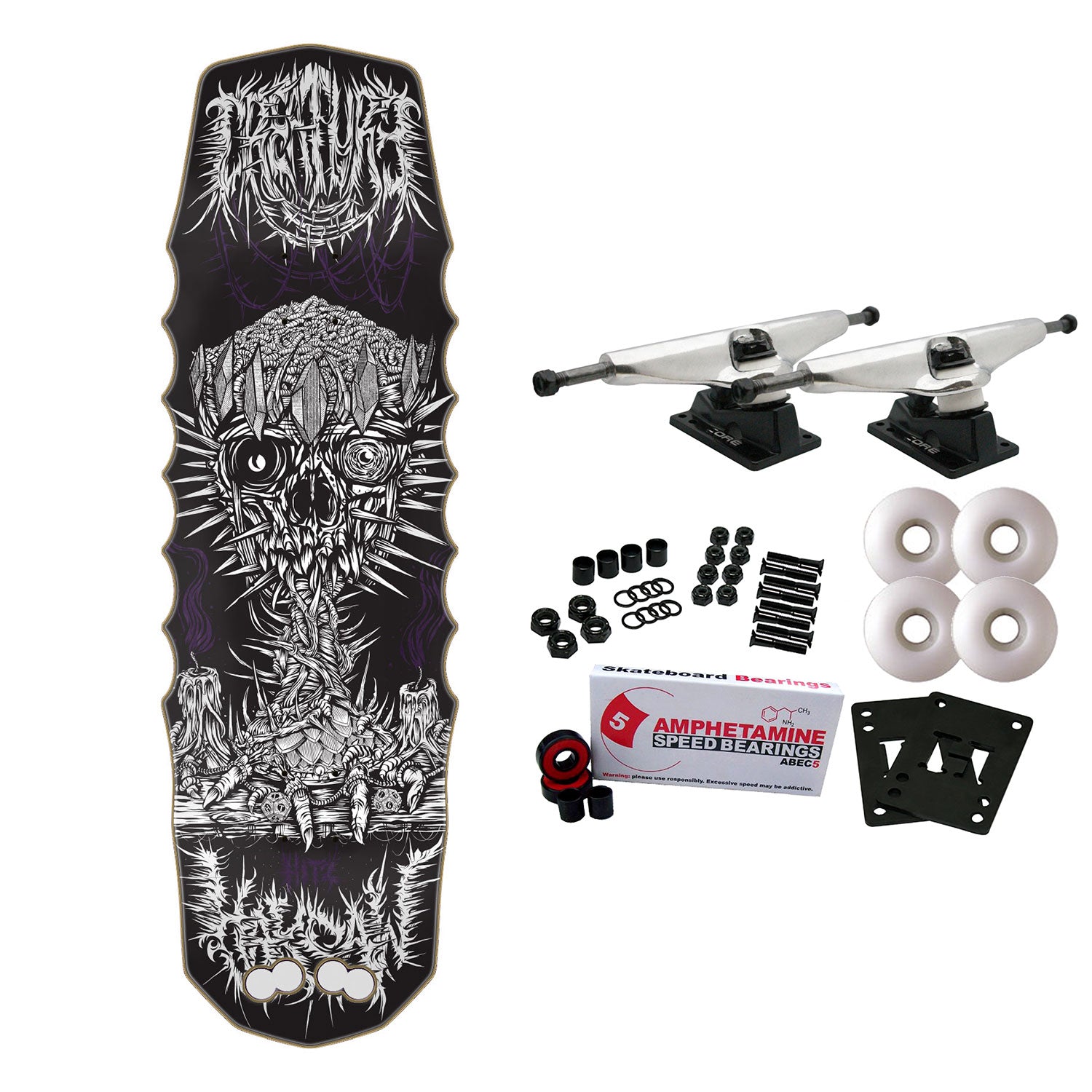 The deadliest shape known to man returns in a BIG way. Hitz' Haksaw Grande Pro 1-Off weighs in at a girthy 9.5" x 32.5" with all the lethal scallops and knuckle grip features you'd expect. Adorned with a goblet full of maggots inked by Kilas, there is no match for this weapon of choice on the battlefield. Comes with Core trucks, 58mm 97A wheels, Amp abec 5 bearings, Black Diamond Griptape, risers, and hardware. Core trucks are light weight and feature heavy duty aluminum with grade 8 steel kingpins and axles, as well as USA made bushings and pivot cups. 58mm 97A are the perfect wheels for both street and park skating. Like the name states, Amp bearings are stimulants for your wheels! Light synthetic oil, Delrin Crowns, and Rubber Serviceable Shields are a few of the things that makes these bearings one of the best Abec 5 rated bearings on the market. Arrives un-assembled which allows for customization and a feeling of accomplishment. Skaters love building their boards! Easy to assemble!