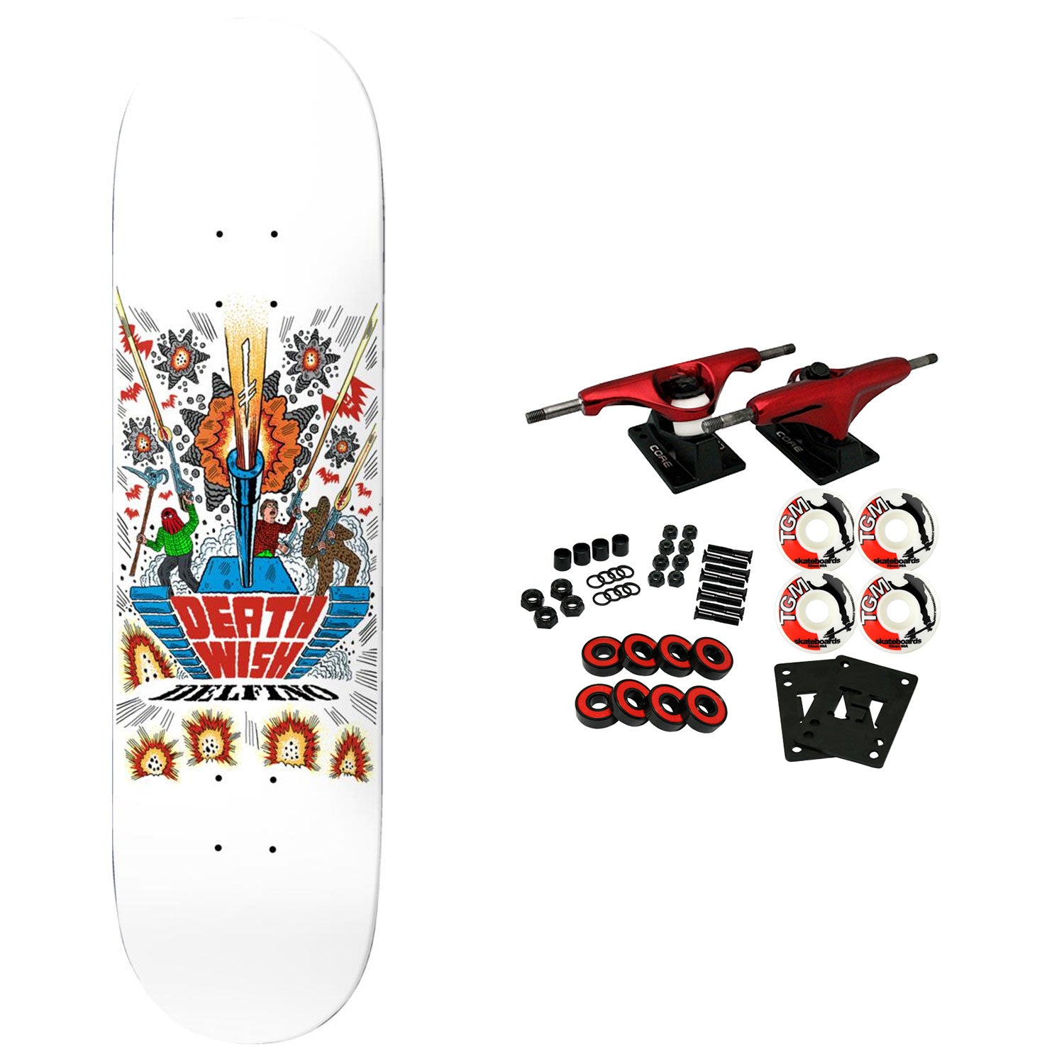 Deathwish boards are constructed with Premium 7-Ply North American Maple. This board measures 8.38" x 31.875". Dipped. Deathwitch Trials Art by JJ Villard. Comes with Core trucks, 52mm TGM logo wheels, Amp abec 5 bearings, Black Diamond Griptape, risers, and hardware. Core trucks are light weight and feature heavy duty aluminum with grade 8 steel kingpins and axles, as well as USA made bushings and pivot cups. 52mm 99A are the perfect wheels for both street and park skating. Like the name states, Amp bearings are stimulants for your wheels! Light synthetic oil, Delrin Crowns, and Rubber Serviceable Shields are a few of the things that makes these bearings one of the best Abec 5 rated bearings on the market. Arrives un-assembled which allows for customization and a feeling of accomplishment. Skaters love building their boards! Easy to assemble!