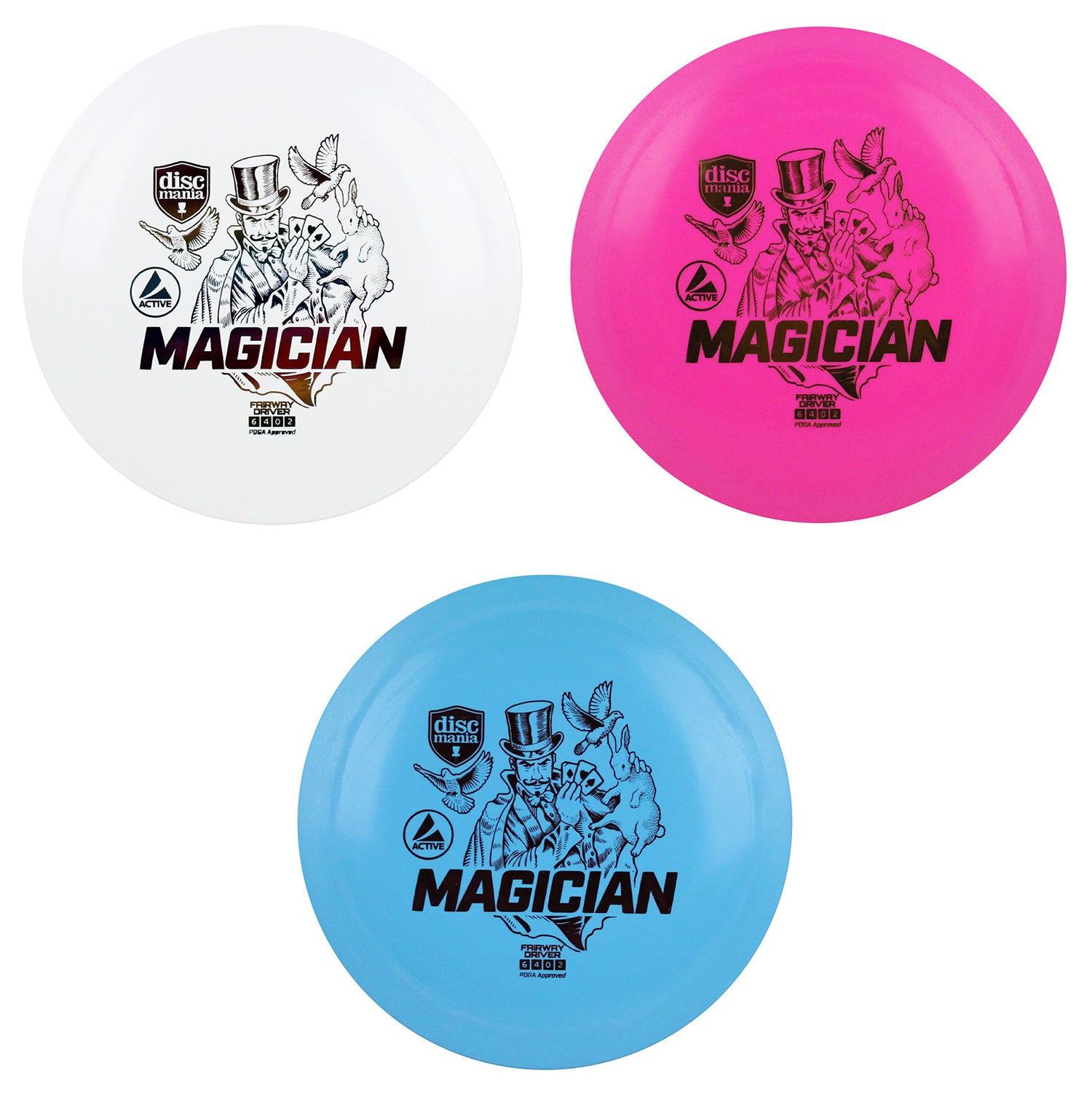 The Magician is the brand new fairway driver featured as a part of the Discmania Active lineup. The Magician is a stable fairway driver designed to give all players a fairway driver that can be trusted in all conditions. The Magician flies straight with minimal turn and a reliable fade at the end giving this disc a flight that can be trusted and repeated. The stability of the Magician allows it to be a great forehand approach disc in addition to its backhand capabilities. Rated at a speed 6, the Magician has a smaller rim that makes this disc comfortable for all hand sizes. The Active plastic is the perfect balance between keeping the disc firm as well as soft to the touch meaning the disc always feels comfortable and natural in the hand.