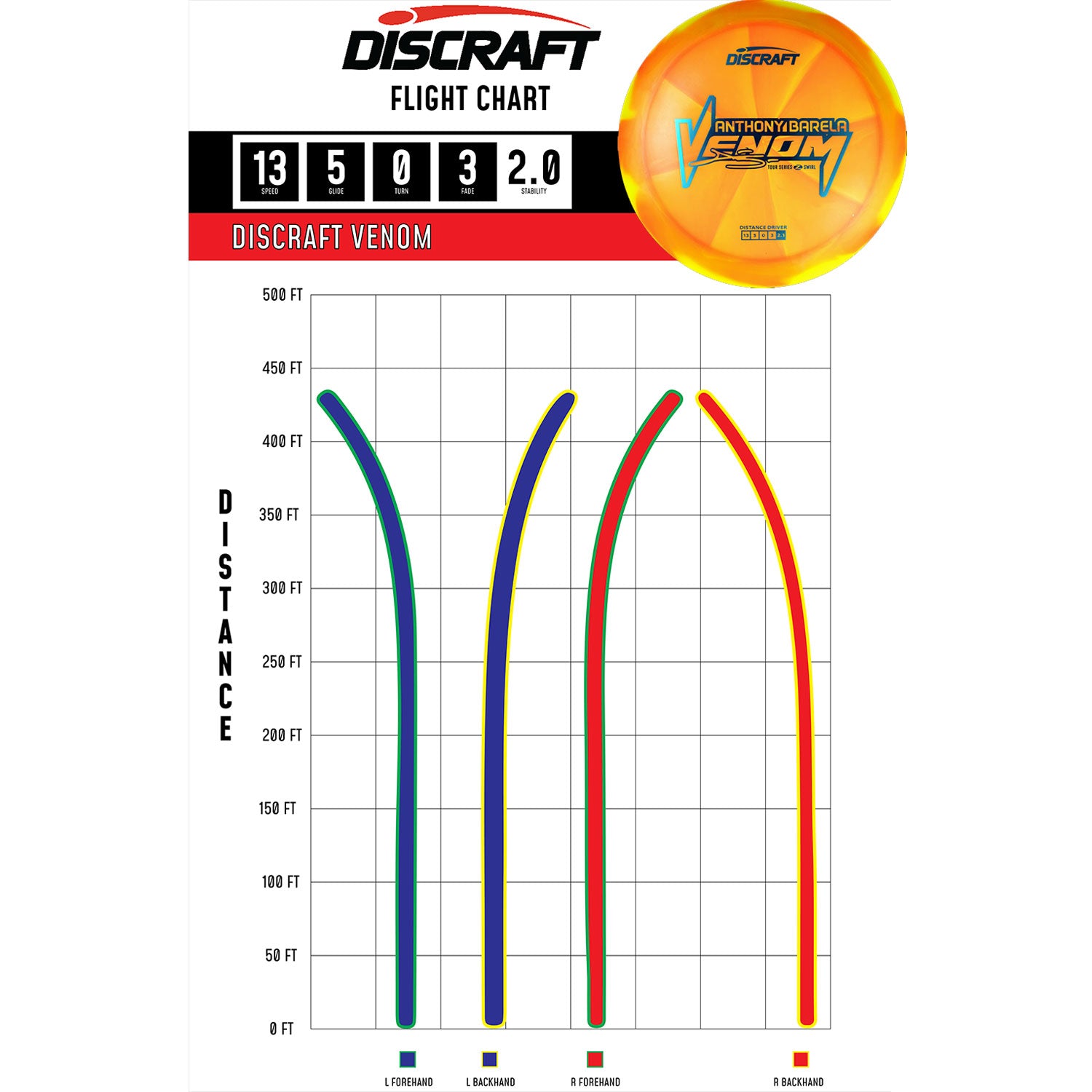 Anthony Barela’s 2025 Tour Series Venom is all gas—fast, overstable, and built for elite power. The Z Swirl blend softens the grip just enough for control, while keeping the Venom’s signature overstability intact. Designed for huge hyzers, force-over flexes, and skip shots, this disc was designed for you to reach your distance potential.