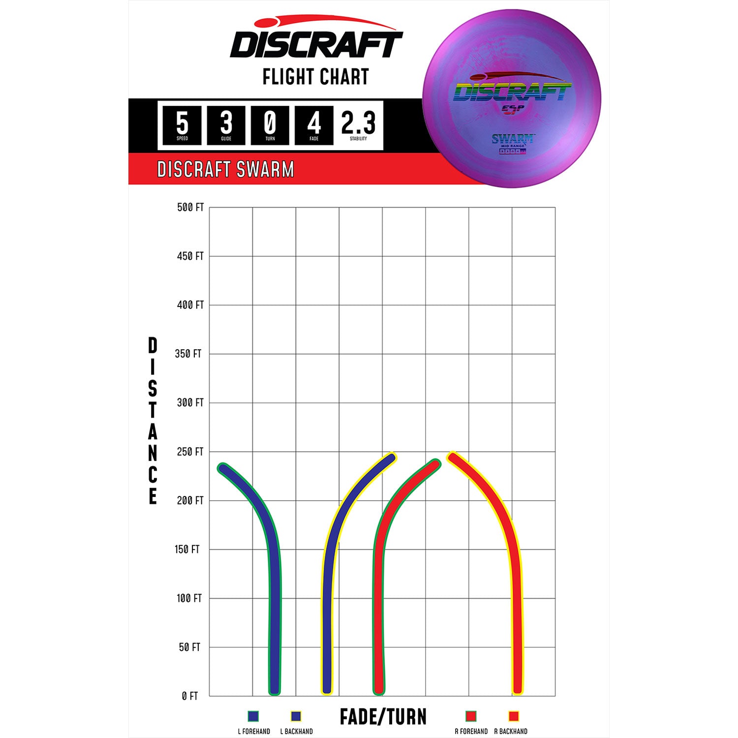 Introducing the swarm, crafted from Discraft's premium ESP plastic blend. This disc offers a perfect balance of stability, durability, and grip, making it an excellent choice for players of all skill levels. The Swarm's design promotes a very overstable flight with a predictable fade, ensuring consistent performance on the course.