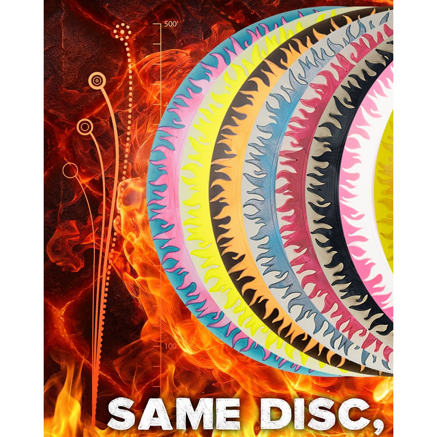 The long-awaited stock FuZed Scorch is here! Featuring our special FuZed Line process, each disc boasts a vibrant flame-burst effect on the rim. This run is notably domey, adding extra glide for those big turnover shots and hyzer flips that define the Scorch’s signature flight.