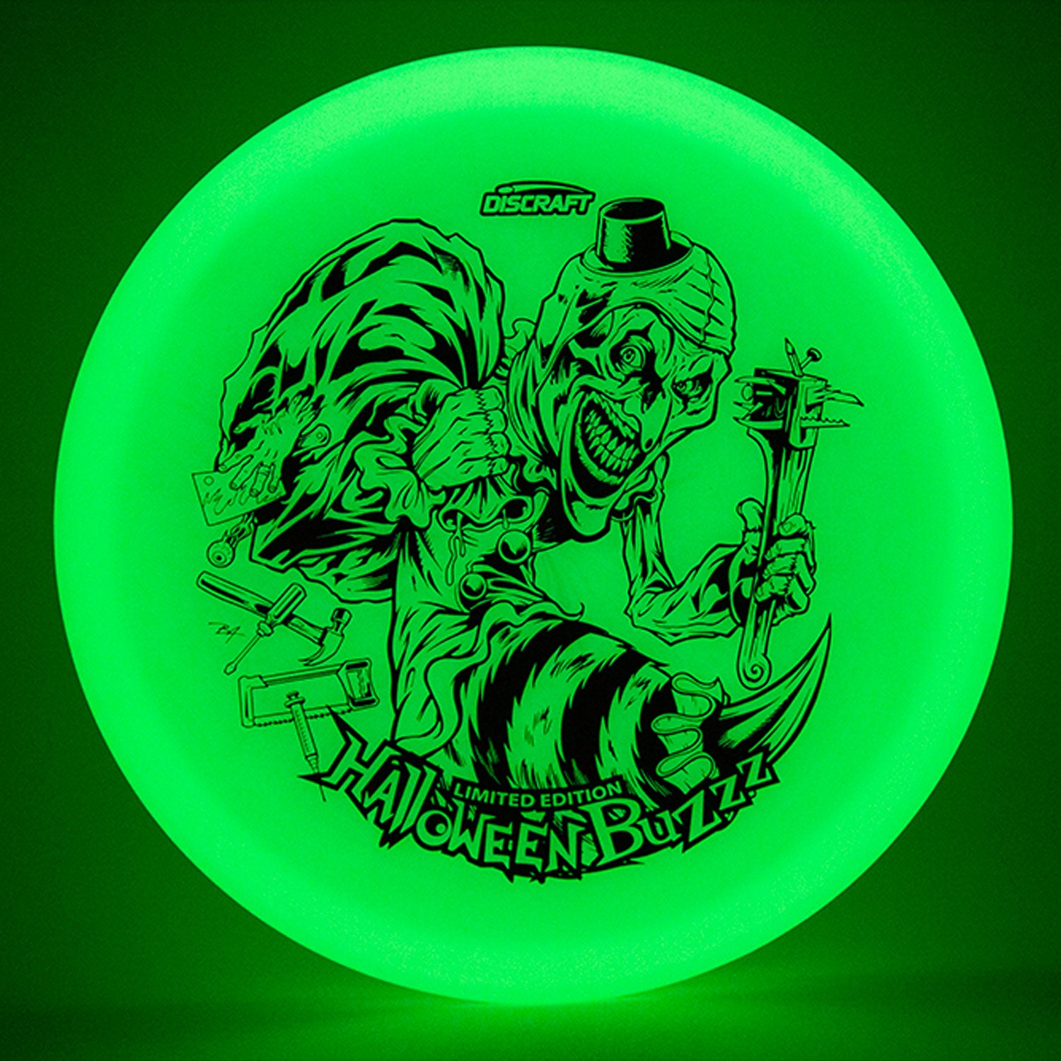 The Single-Foil Mega-Glo Halloween Buzzz turns darkness into its stage. Made from Discraft's popular Mega-Glo blend, this disc shines brighter and longer than any glow disc we’ve ever made. A minimalist single-foil stamp lets the unsettling clown artwork glow through the night—perfect for glow leagues or collectors seeking the most luminous Halloween Buzzz to date!