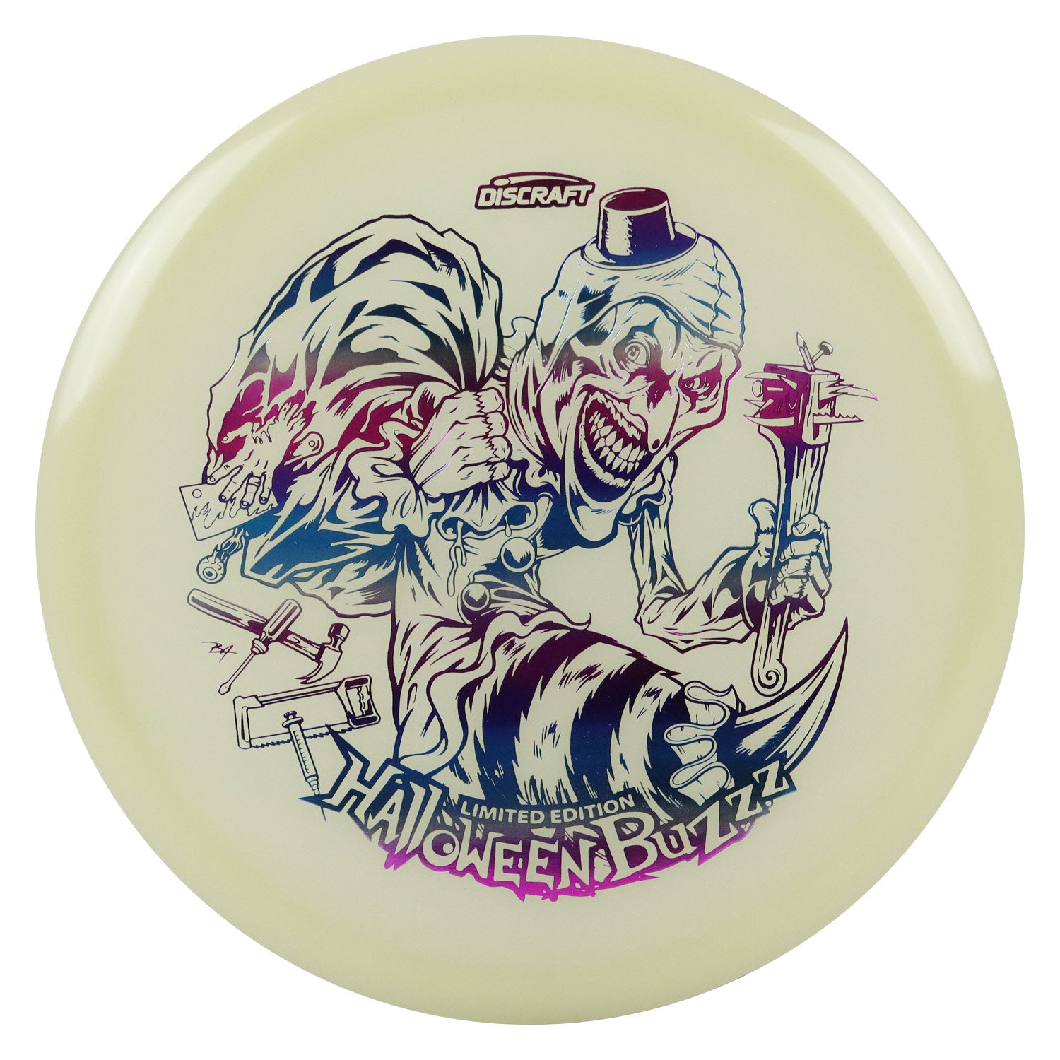 The Single-Foil Mega-Glo Halloween Buzzz turns darkness into its stage. Made from Discraft's popular Mega-Glo blend, this disc shines brighter and longer than any glow disc we’ve ever made. A minimalist single-foil stamp lets the unsettling clown artwork glow through the night—perfect for glow leagues or collectors seeking the most luminous Halloween Buzzz to date!