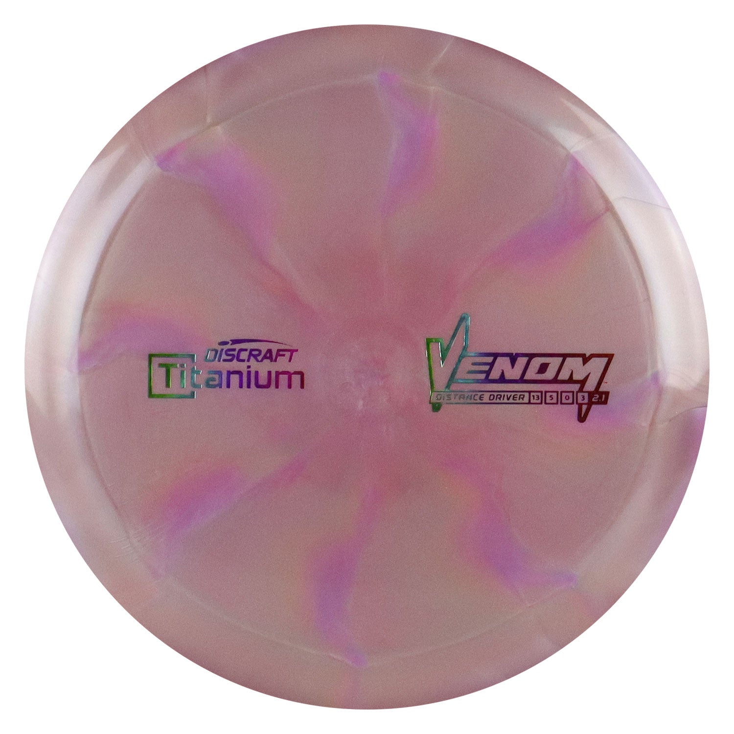 Introducing the Venom in our new Ti plastic blend, now featuring a tackier grip that delivers unmatched control and confidence on every throw. The Venom's fast and overstable flight path is complemented by the mesmerizing swirls in the plastic, ensuring each disc is a visual standout. Designed for power throwers and forehand specialists, the Ti Venom offers exceptional stability and a reliable finish. The enhanced grip ensures consistent performance, allowing you to harness the full potential of your throws with precision and power.