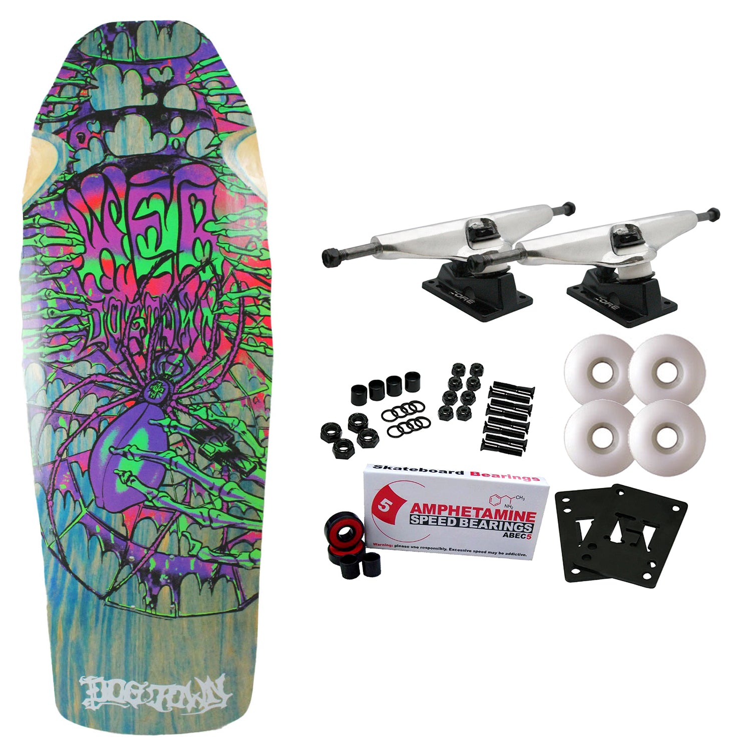 The Web was an instrumental board design in the early development of Dogtown team riders and grass root skateboarding of the mid 1980's. We added the Webs as an element to give you extra grip on the rails, especially for Aaron Murray who is missing 2 fingers on his right hand. Made at PS Stix. Comes with Core trucks, 58mm 97A wheels, Amp abec 5 bearings, Black Diamond Griptape, risers, and hardware. Core trucks are light weight and feature heavy duty aluminum with grade 8 steel kingpins and axles, as well as USA made bushings and pivot cups. 58mm 97A are the perfect wheels for both street and park skating. Like the name states, Amp bearings are stimulants for your wheels! Light synthetic oil, Delrin Crowns, and Rubber Serviceable Shields are a few of the things that makes these bearings one of the best Abec 5 rated bearings on the market. Arrives un-assembled which allows for customization and a feeling of accomplishment. Skaters love building their boards! Easy to assemble!
