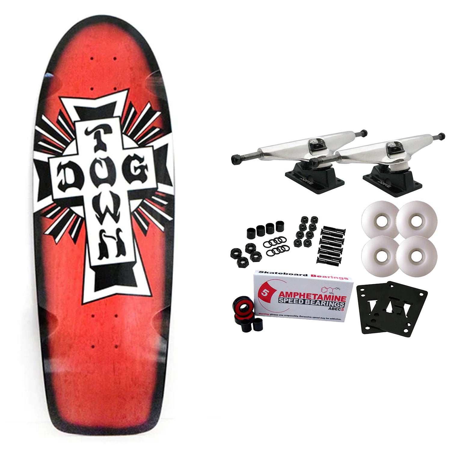 70s Classic Shape with a Modern Concave. Measures 10" x 30.575" with a 14.75" wheelbase. Comes with Core trucks, 58mm 97A wheels, Amp abec 5 bearings, Black Diamond Griptape, risers, and hardware. Core trucks are light weight and feature heavy duty aluminum with grade 8 steel kingpins and axles, as well as USA made bushings and pivot cups. 58mm 97A are the perfect wheels for both street and park skating. Like the name states, Amp bearings are stimulants for your wheels! Light synthetic oil, Delrin Crowns, and Rubber Serviceable Shields are a few of the things that makes these bearings one of the best Abec 5 rated bearings on the market. Arrives un-assembled which allows for customization and a feeling of accomplishment. Skaters love building their boards! Easy to assemble!