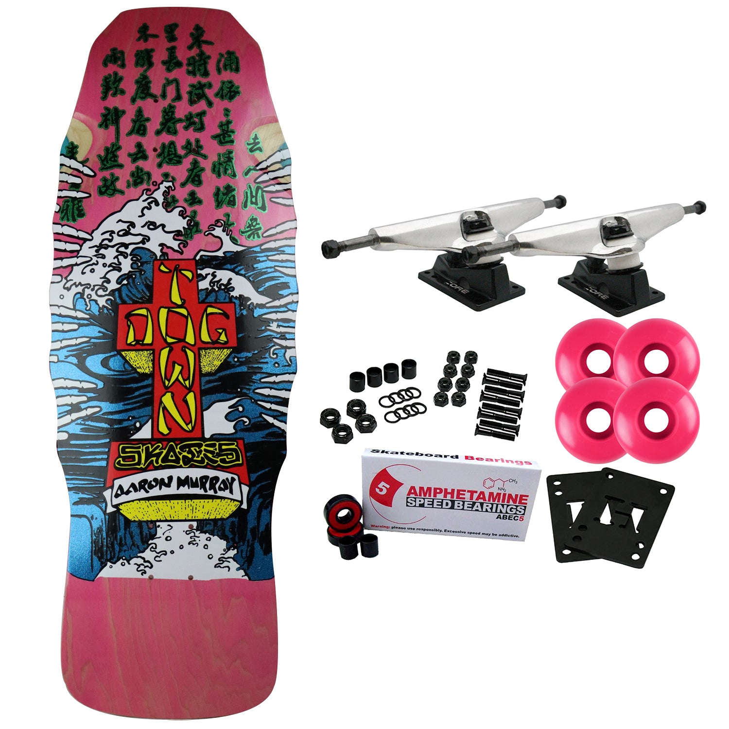 Dogtown Aaron Murray ReIssue Deck. Deck features front wheel wells. Art by Kevin Ancell. Made by PS Stix. Measures 10.5" x 31" with a 15.5" wheelbase. Comes with Core trucks, 58mm 97A wheels, Amp abec 5 bearings, Black Diamond Griptape, risers, and hardware. Core trucks are light weight and feature heavy duty aluminum with grade 8 steel kingpins and axles, as well as USA made bushings and pivot cups. 58mm 97A are the perfect wheels for both street and park skating. Like the name states, Amp bearings are stimulants for your wheels! Light synthetic oil, Delrin Crowns, and Rubber Serviceable Shields are a few of the things that makes these bearings one of the best Abec 5 rated bearings on the market. Arrives un-assembled which allows for customization and a feeling of accomplishment. Skaters love building their boards! Easy to assemble!
