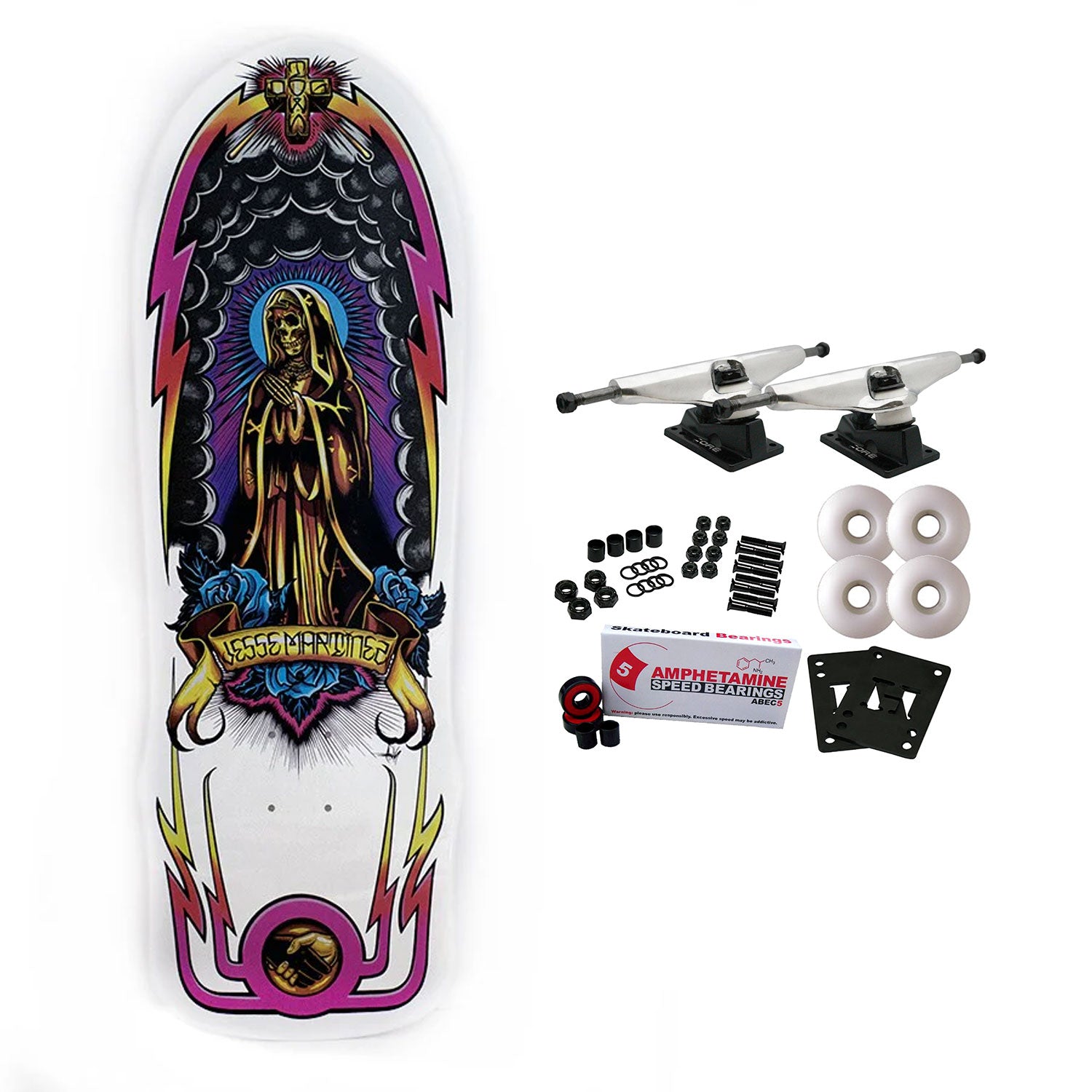 Dogtown Jesse Martinez Guadalupe Handshake 1987 deck. Jesse's 1987 Pro shape. Art by Axis. Made at BBS. White Full Dip. Measures 10" x 30.25" with a 15.5" wheelbase. Comes with Core trucks, 52mm TGM logo wheels, Amp abec 5 bearings, Black Diamond Griptape, risers, and hardware. Core trucks are light weight and feature heavy duty aluminum with grade 8 steel kingpins and axles, as well as USA made bushings and pivot cups. 52mm 99A are the perfect wheels for both street and park skating. Like the name states, Amp bearings are stimulants for your wheels! Light synthetic oil, Delrin Crowns, and Rubber Serviceable Shields are a few of the things that makes these bearings one of the best Abec 5 rated bearings on the market. Arrives un-assembled which allows for customization and a feeling of accomplishment. Skaters love building their boards! Easy to assemble!