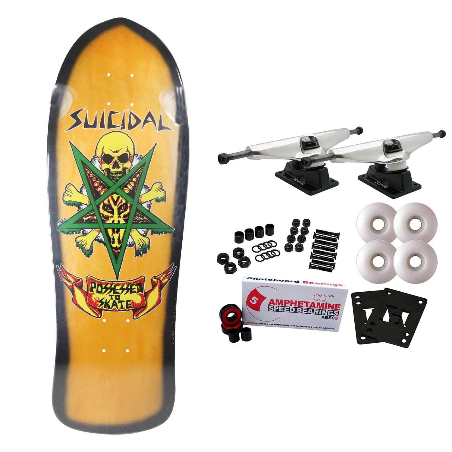 Suicidal Skates Possessed to Skate Reissue. Made at PS Stix Measures. 10.125" x 30.825" with a 15" wheelbase. Comes with Core trucks, 58mm 97A wheels, Amp abec 5 bearings, Black Diamond Griptape, risers, and hardware. Core trucks are light weight and feature heavy duty aluminum with grade 8 steel kingpins and axles, as well as USA made bushings and pivot cups. 58mm 97A are the perfect wheels for both street and park skating. Like the name states, Amp bearings are stimulants for your wheels! Light synthetic oil, Delrin Crowns, and Rubber Serviceable Shields are a few of the things that makes these bearings one of the best Abec 5 rated bearings on the market. Arrives un-assembled which allows for customization and a feeling of accomplishment. Skaters love building their boards! Easy to assemble!