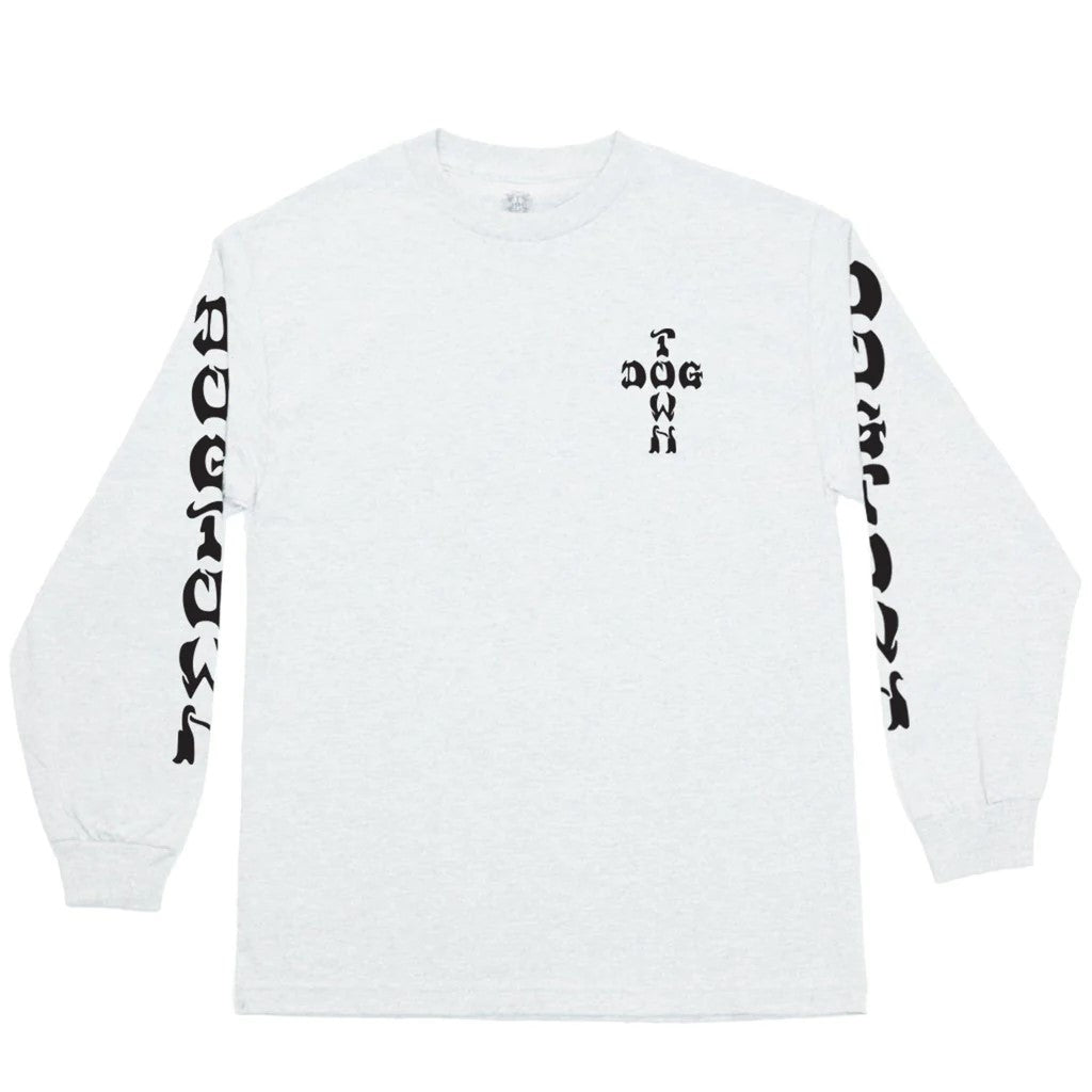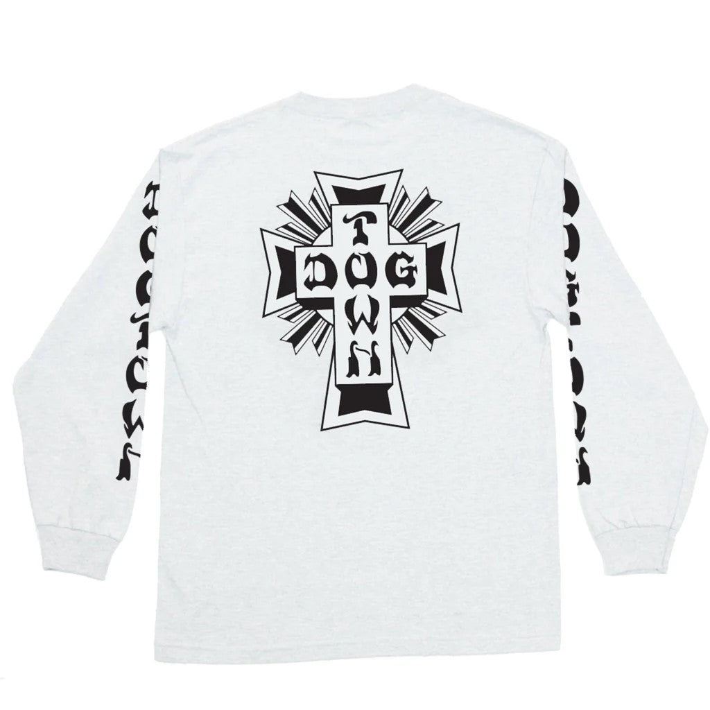 Cross Logo Long Sleeve. Large Dogtown Cross Logo on back. Small Dogtown Cross Logo front print on left chest. DOGTOWN Down both sleeves. 100% Cotton.