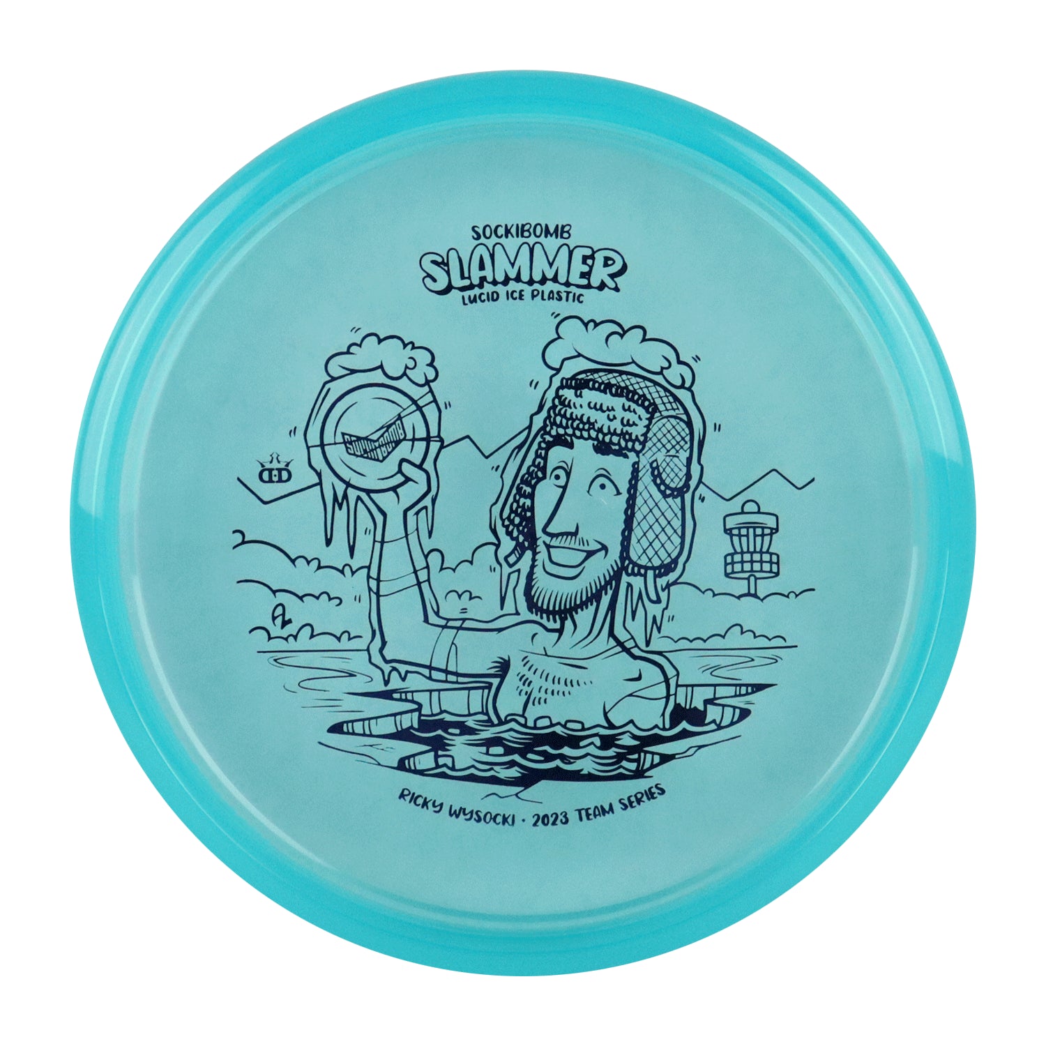 The Sockibomb Slammer was one of our most popular molds in 2023 and we're confident that the new premium plastic version will be a hit with disc golfers everywhere. Whether you're a seasoned pro or a casual player, the Lucid-Ice Sockibomb Slammer with the cartoon Ice Bath stamp is sure to turn heads on the course.