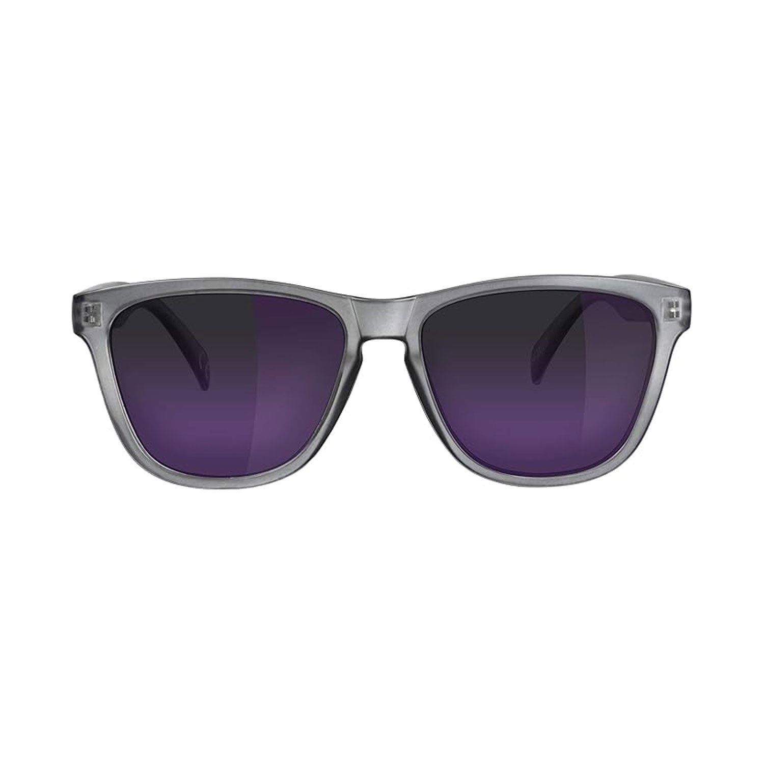 Glassy Eyewear Sunglasses Deric Polarized Matte Transparent Dark Grey/Purple Mirror. Polarized Lenses to enhance clarity and depth perception. Spring hinges for extra comfort. Impact-resistant lenses for extra strength. 100% UV protected.