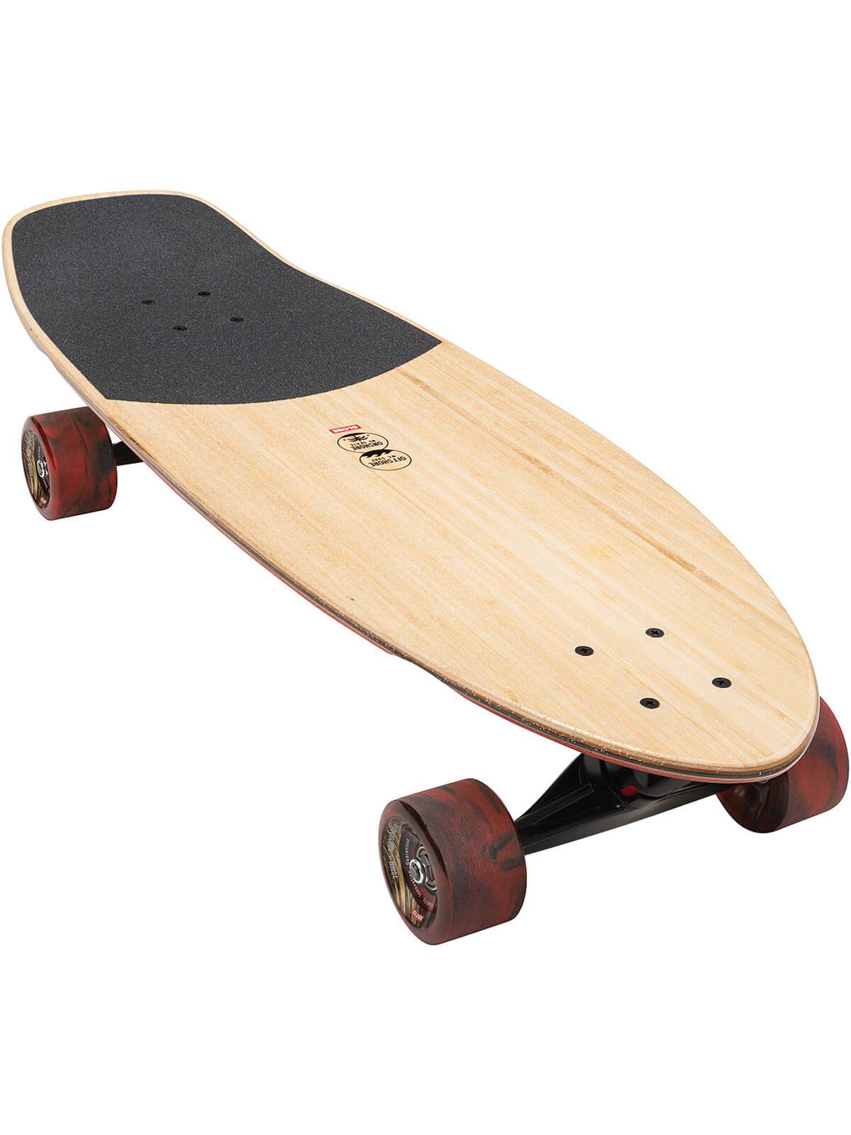 The Zuma in colour Onshore/Flat comes in size 31.5" x 9.7" x 18.75"wb. Wider wheelbase board for bigger guys with Revenge surf/skate trucks for a fun surf-like carving experience. It is a Mellow concave with kicktail made of Bamboo. It features 175mm Revenge Alpha II trucks and 70mm 83a Onshore wheels. Black grip + clear broadcast.