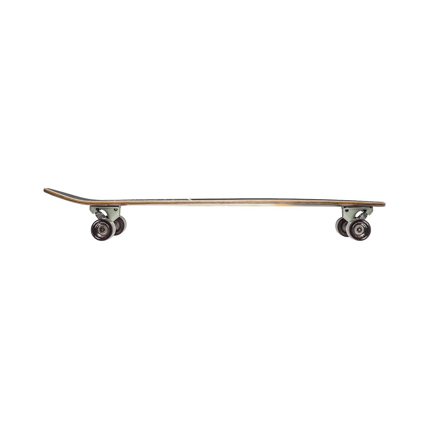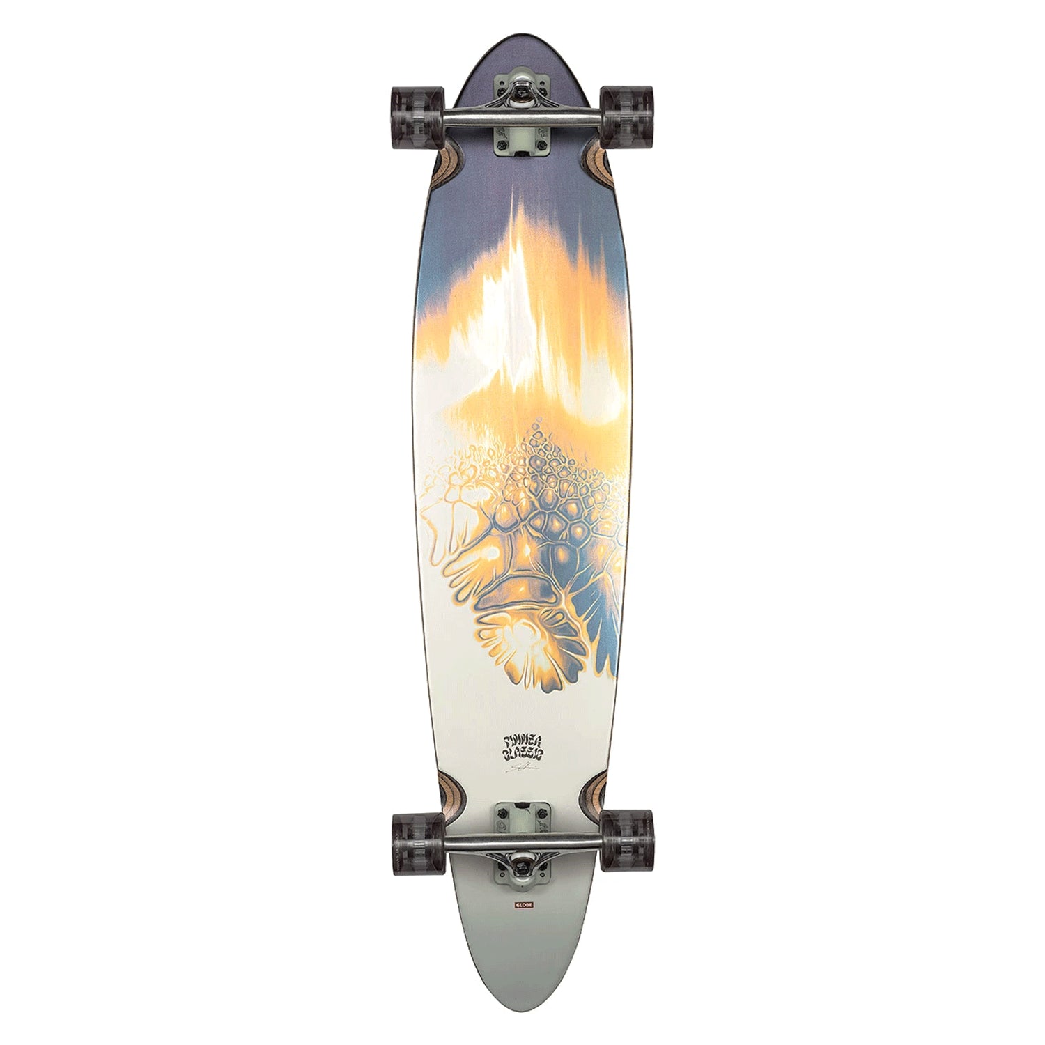 The Pinner Classic in Gold Vein is a classic pintail longboard with a kicktail, featuring deck and grip tape artwork by featured artist Sam Chirnside. The deck is constructed from Resin-8 hard rock maple, featuring mellow concave and embedded metal badge detail. Also featuring 180mm Slant reverse kingpin trucks, 65mm 78a wheels, and die-cut, printed grip tape.