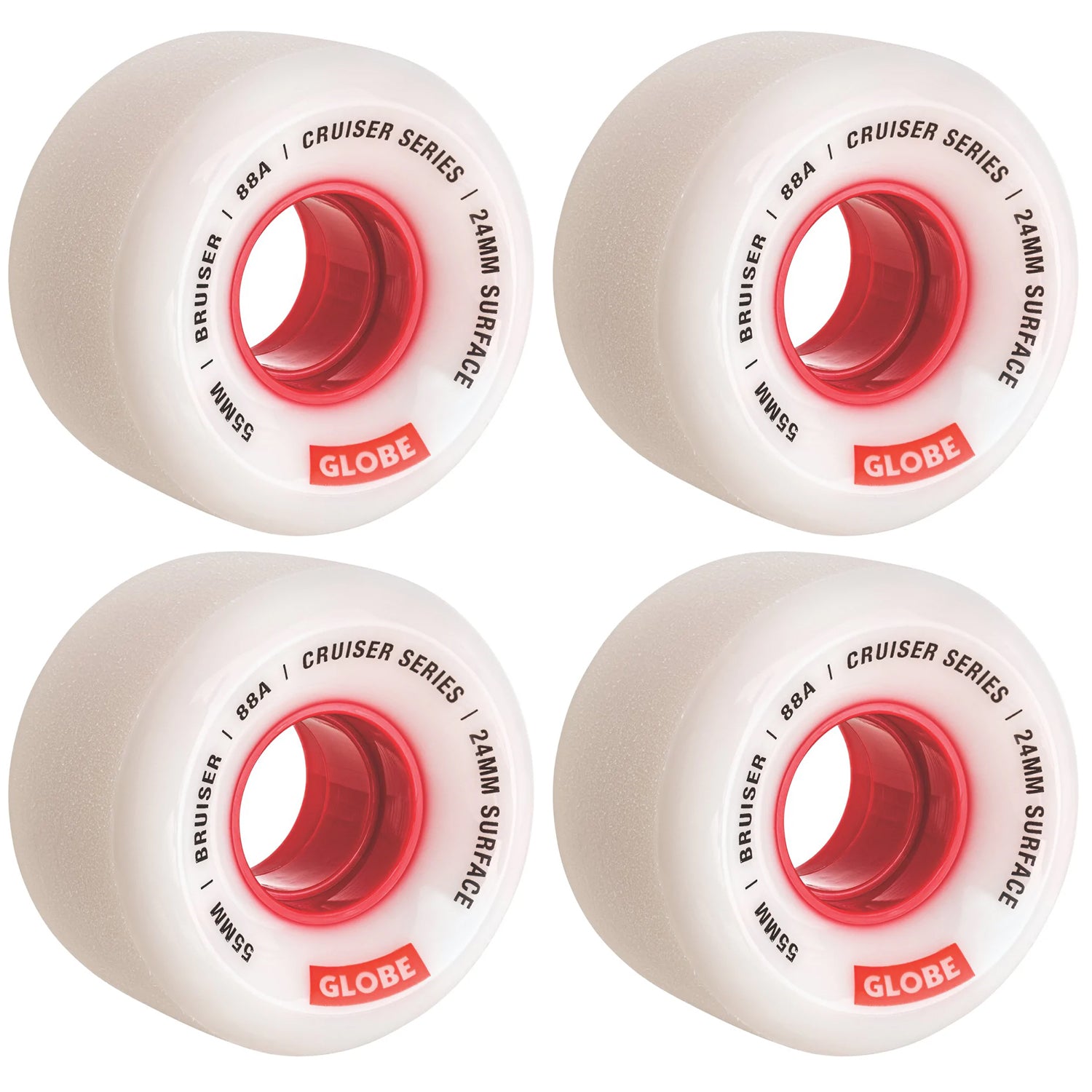 The Bruiser Cruiser Wheel in White/Red/55 is an all terrain cruiser wheel with street performance shape and characteristics. A little wider than a traditional street wheel with a face that cuts back toward the core for weight reduction and added response.