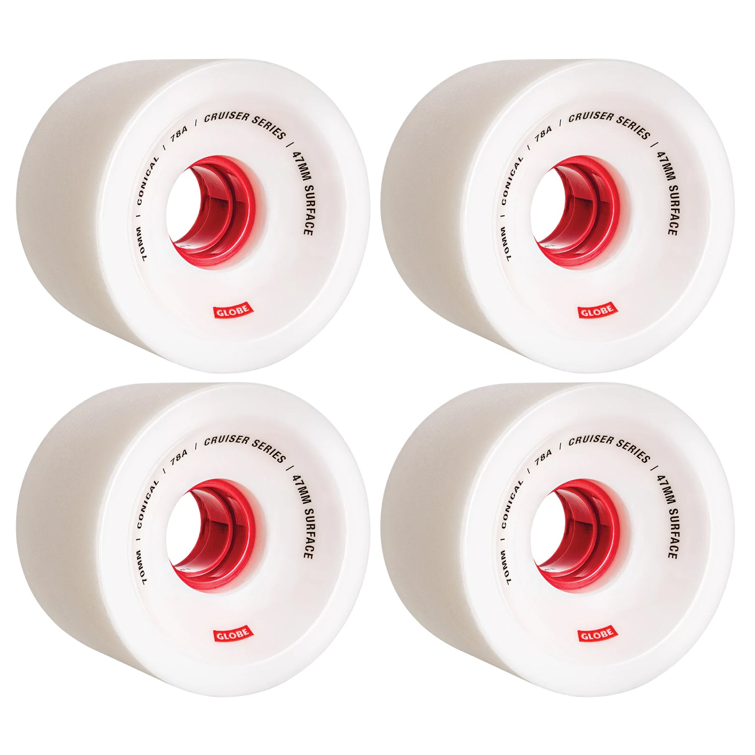 The Conical Cruiser wheel in white/red 70mm 78A is the hands-down most popular cruiser and longboard wheel shape for a smooth ride. It’s Ideal for cruising and carving on any surface, super-sticky, holds turns and slides consistently, and its stone ground for traction from the first push.