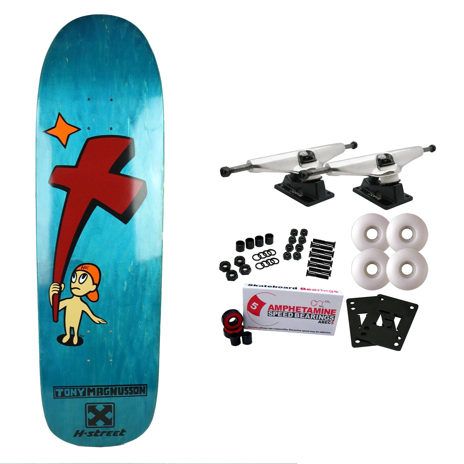 H-Street Skateboards are made with 7-Ply North American Maple. Measures 9.0" x 32.5". Comes with Core trucks, 58mm 97A wheels, Amp abec 5 bearings, Black Diamond Griptape, risers, and hardware. Core trucks are light weight and feature heavy duty aluminum with grade 8 steel kingpins and axles, as well as USA made bushings and pivot cups. 58mm 97A are the perfect wheels for both street and park skating. Like the name states, Amp bearings are stimulants for your wheels! Light synthetic oil, Delrin Crowns, and Rubber Serviceable Shields are a few of the things that makes these bearings one of the best Abec 5 rated bearings on the market. Arrives un-assembled which allows for customization and a feeling of accomplishment. Skaters love building their boards! Easy to assemble!