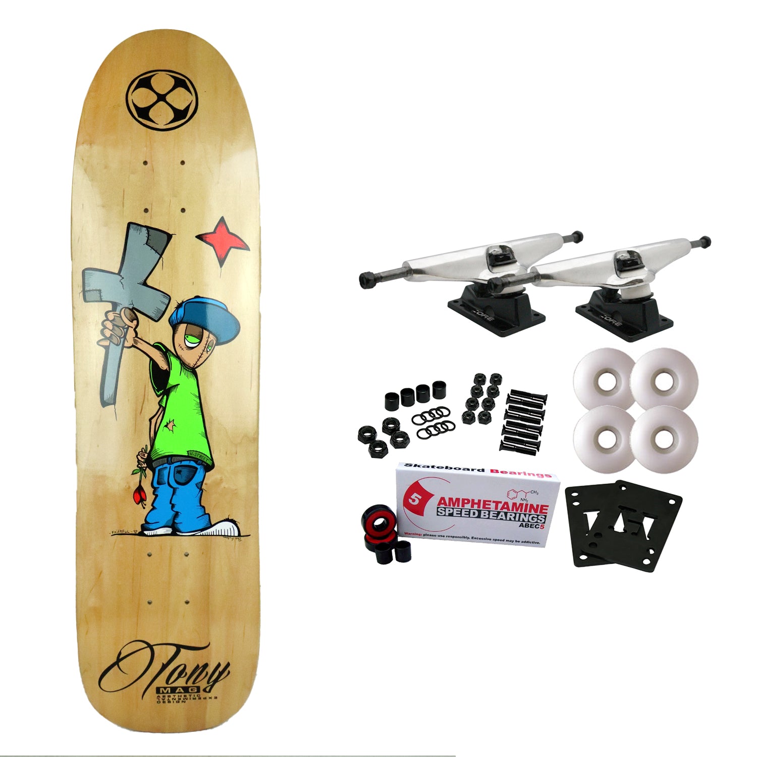 H-Street Skateboards are made with 7-Ply North American Maple. Measures 8.0" x 32". Comes with Core trucks, 58mm 97A wheels, Amp abec 5 bearings, Black Diamond Griptape, risers, and hardware. Core trucks are light weight and feature heavy duty aluminum with grade 8 steel kingpins and axles, as well as USA made bushings and pivot cups. 58mm 97A are the perfect wheels for both street and park skating. Like the name states, Amp bearings are stimulants for your wheels! Light synthetic oil, Delrin Crowns, and Rubber Serviceable Shields are a few of the things that makes these bearings one of the best Abec 5 rated bearings on the market. Arrives un-assembled which allows for customization and a feeling of accomplishment. Skaters love building their boards! Easy to assemble!