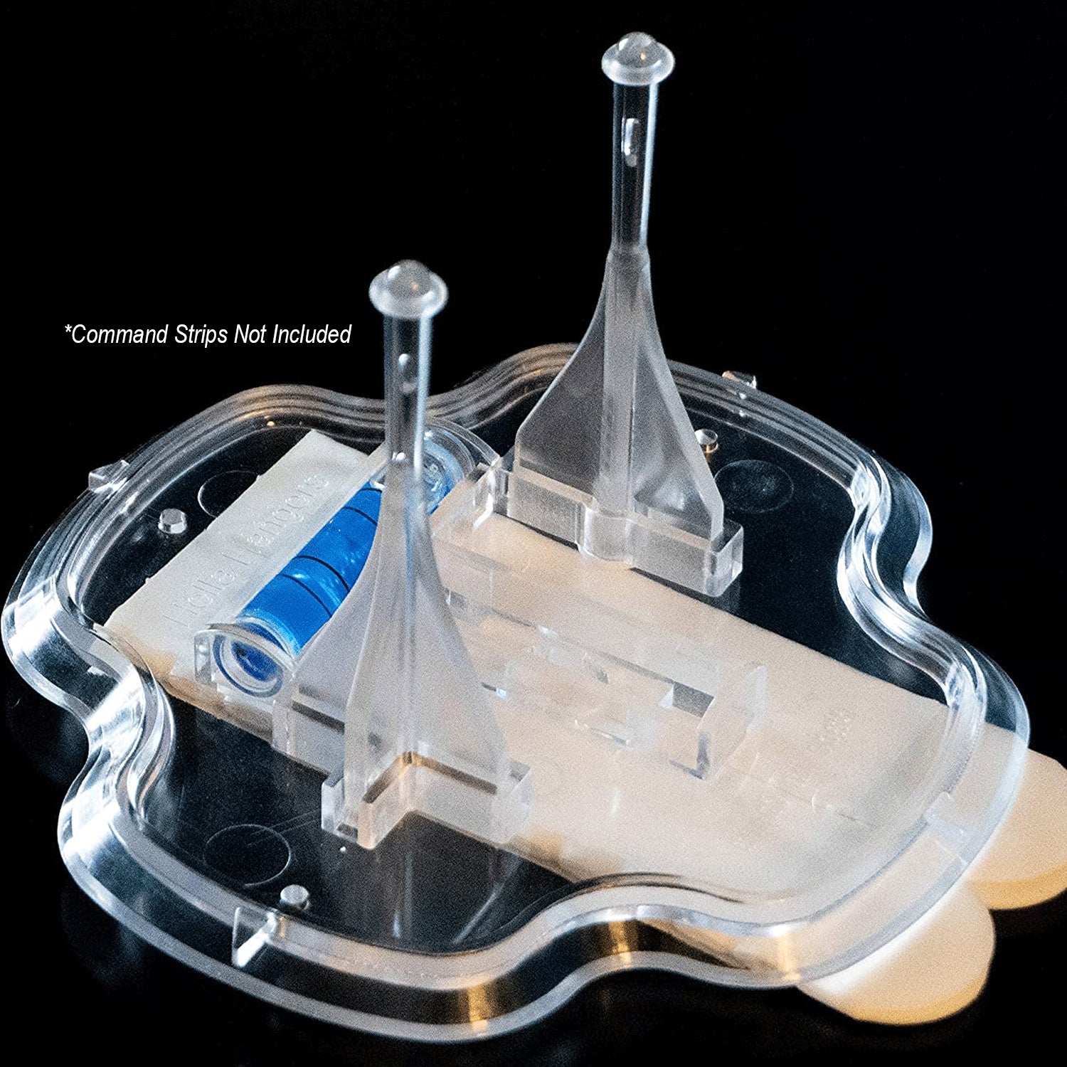 - INCLUDES: 1 clear hanger base, 2 clear support pins, 2 pairs of O-rings (transparent and black), 1 bubble level, and 1 screw.
