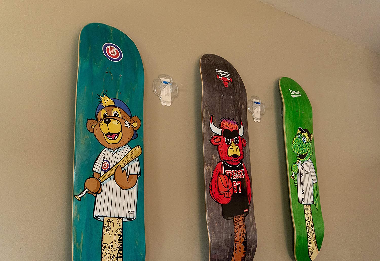 - The clear skateboard mount is the perfect accessory for any skateboard enthusiast. This deck hanger provides a floating deck effect. Hang up your deck art to show it off so it's not laying around the house or in storage. Hang in a garage, living room, office, or bedroom; make's any space look cooler!