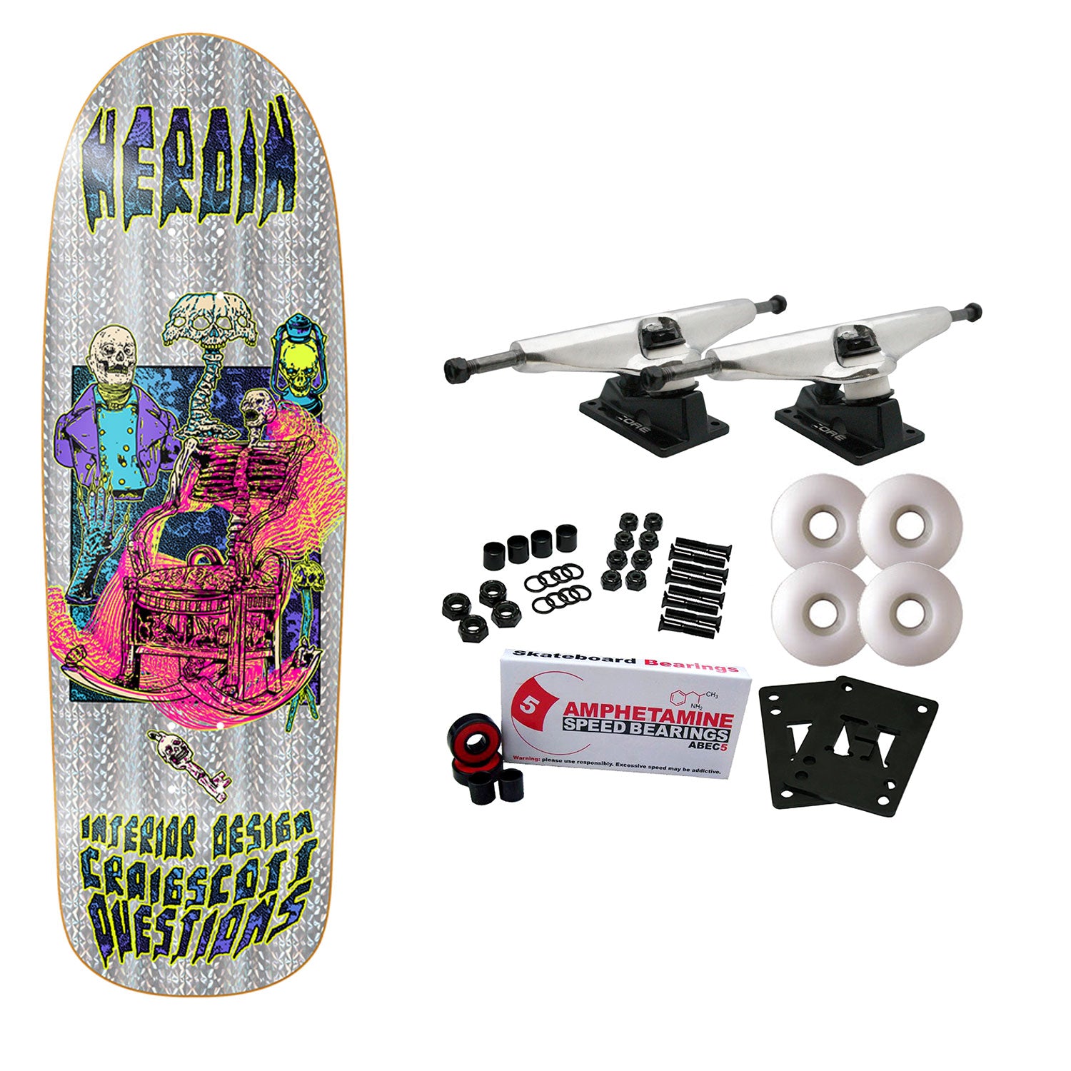 Heroin Skateboards are constructed with 7-Ply Premium North American Maple. This deck measures 10" x 32". Comes with Core trucks, 58mm 97A wheels, Amp abec 5 bearings, Black Diamond Griptape, risers, and hardware. Core trucks are light weight and feature heavy duty aluminum with grade 8 steel kingpins and axles, as well as USA made bushings and pivot cups. 58mm 97A are the perfect wheels for both street and park skating. Like the name states, Amp bearings are stimulants for your wheels! Light synthetic oil, Delrin Crowns, and Rubber Serviceable Shields are a few of the things that makes these bearings one of the best Abec 5 rated bearings on the market. Arrives un-assembled which allows for customization and a feeling of accomplishment. Skaters love building their boards! Easy to assemble!