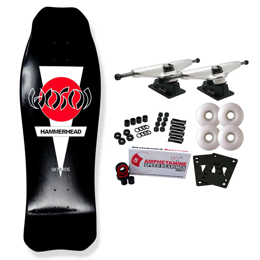 7 Ply Hard Rock Maple, measures 10.25" x 31" with a 15.5" wheelbase. Hosoi Skateboard decks are Made in the USA. Comes with Core trucks, 58mm 97A wheels, Amp abec 5 bearings, Black Diamond Griptape, risers, and hardware. Core trucks are light weight and feature heavy duty aluminum with grade 8 steel kingpins and axles, as well as USA made bushings and pivot cups. 58mm 97A are the perfect wheels for both street and park skating. Like the name states, Amp bearings are stimulants for your wheels! Light synthetic oil, Delrin Crowns, and Rubber Serviceable Shields are a few of the things that makes these bearings one of the best Abec 5 rated bearings on the market. Arrives un-assembled which allows for customization and a feeling of accomplishment. Skaters love building their boards! Easy to assemble!