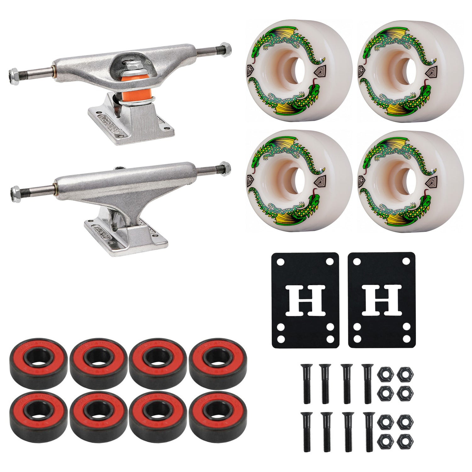 This Independent Trucks Kit features Stage 11 Raw Indy trucks, new Powell Peralta Dragon Formula Wheels, Amp ABEC 5 bearings, 1/8" risers, and 1" black hardware. Independent Stage 11 trucks are durable and high performing for all types of skating. The New Dragon Formula from Powell Peralta features the grip and slide of 99a and 101a wheels, but the durability and softness for all terrain riding. Amp bearings are the epitome of durability and speed, high quality abec 5 bearings ensure long life.