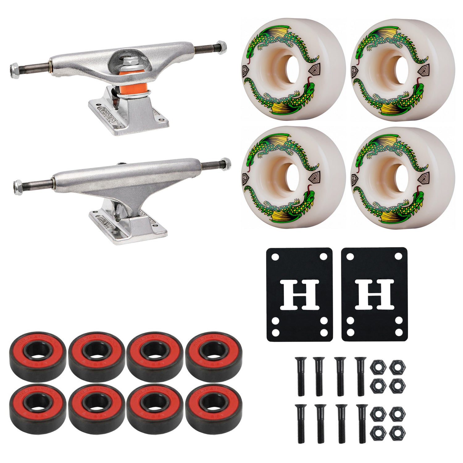 This Independent Trucks Kit features Stage 11 Raw Indy trucks, new Powell Peralta Dragon Formula Wheels, Amp ABEC 5 bearings, 1/8" risers, and 1" black hardware. Independent Stage 11 trucks are durable and high performing for all types of skating. The New Dragon Formula from Powell Peralta features the grip and slide of 99a and 101a wheels, but the durability and softness for all terrain riding. Amp bearings are the epitome of durability and speed, high quality abec 5 bearings ensure long life.