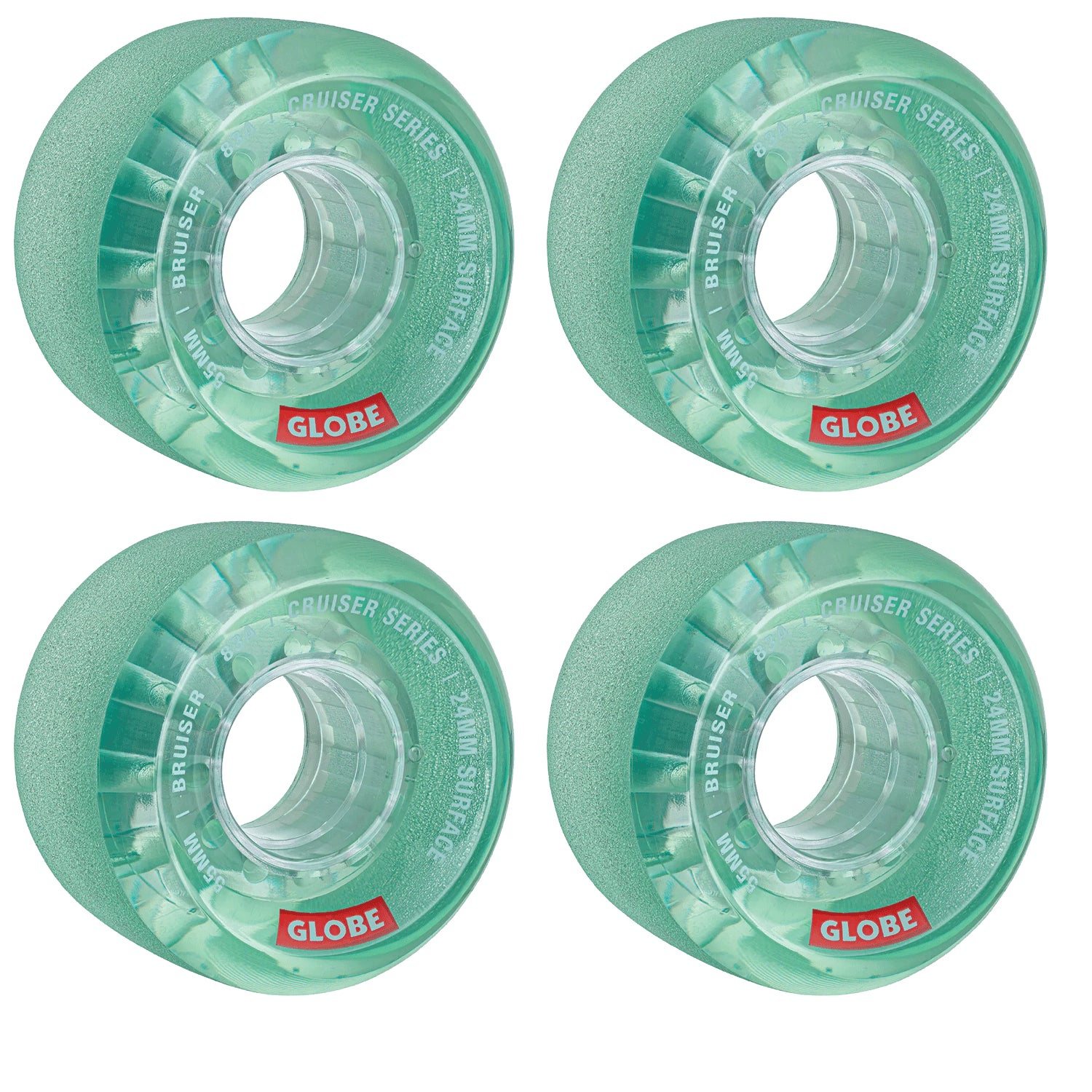 WHEELS: The Bruiser Cruiser Wheel in Clear/Aqua/55 is an all terrain cruiser wheel with street performance shape and characteristics. A little wider than a traditional street wheel with a face that cuts back toward the core for weight reduction and added response.