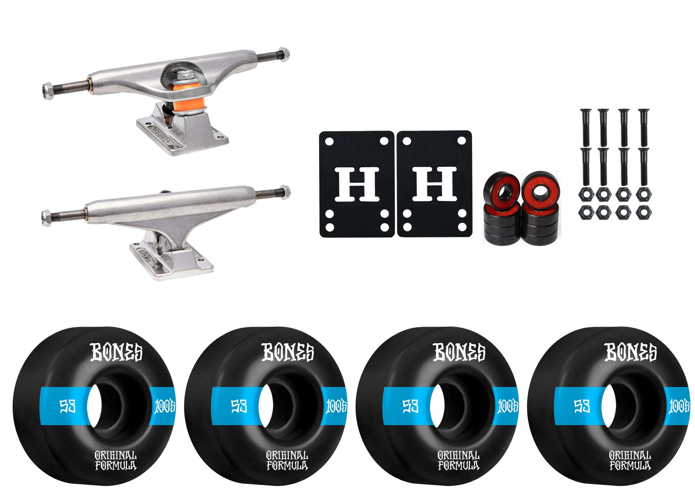This package contains everything you need to make your deck a complete. Includes a set of Independent Mid Trucks, Bones 100's Wheels, Amp Abec 5 Bearings, 1" Hardware, and 1/8" Riser pads. Just add a deck and griptape and you are ready to ride! Indy trucks are a durable, high performance truck for all types of skateboarding. 356 T6 Aluminum hanger and baseplate, solid Chromoly steel axle, grade 8 kingpin, Indy cushions with cylinder bottom. Featuring superior turn and stability, better grind clearance, improved no hang-up yoke for grind tricks, and less wheel bite. They last longer and are stronger on impact than any other truck on the market. These Bones wheels feature the V4 Wide shape, poured with the original 100A formula. These Wheels Measure 53mm x 34mm. Indy 139's Measure 8.0" wide.