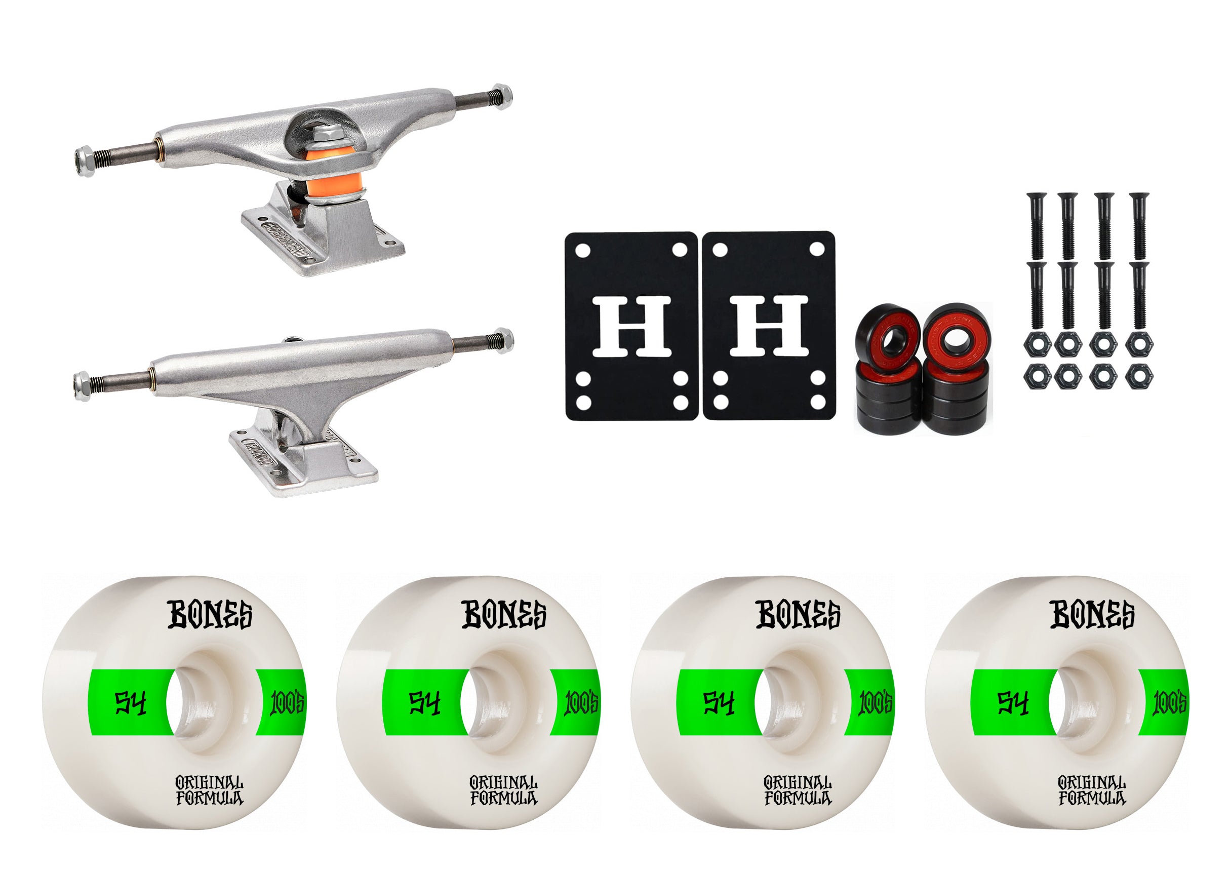 This package contains everything you need to make your deck a complete. Includes a set of Independent Mid Trucks, Bones 100's Wheels, Amp Abec 5 Bearings, 1" Hardware, and 1/8" Riser pads. Just add a deck and griptape and you are ready to ride! Indy trucks are a durable, high performance truck for all types of skateboarding. 356 T6 Aluminum hanger and baseplate, solid Chromoly steel axle, grade 8 kingpin, Indy cushions with cylinder bottom. Featuring superior turn and stability, better grind clearance, improved no hang-up yoke for grind tricks, and less wheel bite. They last longer and are stronger on impact than any other truck on the market. These Bones wheels feature the V4 Wide shape, poured with the original 100A formula. These Wheels Measure 54mm x 34mm. Indy 139's Measure 8.0" wide.