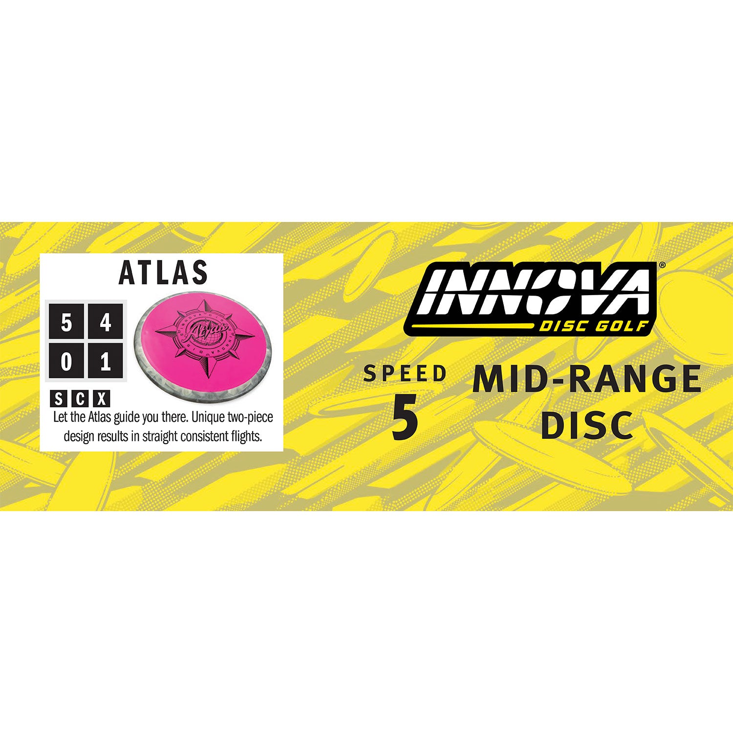 The Atlas is an overmold that combines a firm, low-profile flight plate with a grippy rim. This Mid-Range flies straight with minimal fade, combining accuracy and control with an ergonomic grip. The Atlas performs well for both backhand and forehand throwers forgiving small throwing errors better than any other Mid-Range. The Atlas features four 'compass points' located on the underside of the disc. These ports are where the rim is injected over the flight plate.