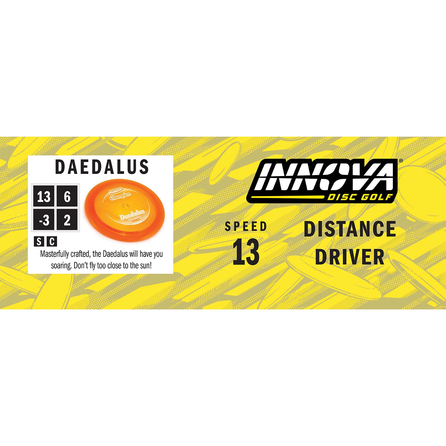 The Daedalus is a speed 13 distance driver for humans who want to soar with gods. The Champion line is produced with a hi-tech plastic that provides outstanding performance and durability. Champion discs are distinguished by a beautiful clear appearance. Designed for professional players, Champion line discs are usually a little firmer and more stable than the same model in other plastics. Whether used in heavily wooded situations, or on extremely rugged courses, our Champion line plastic will continue to perform predictably and avoid damage better than any other plastic.