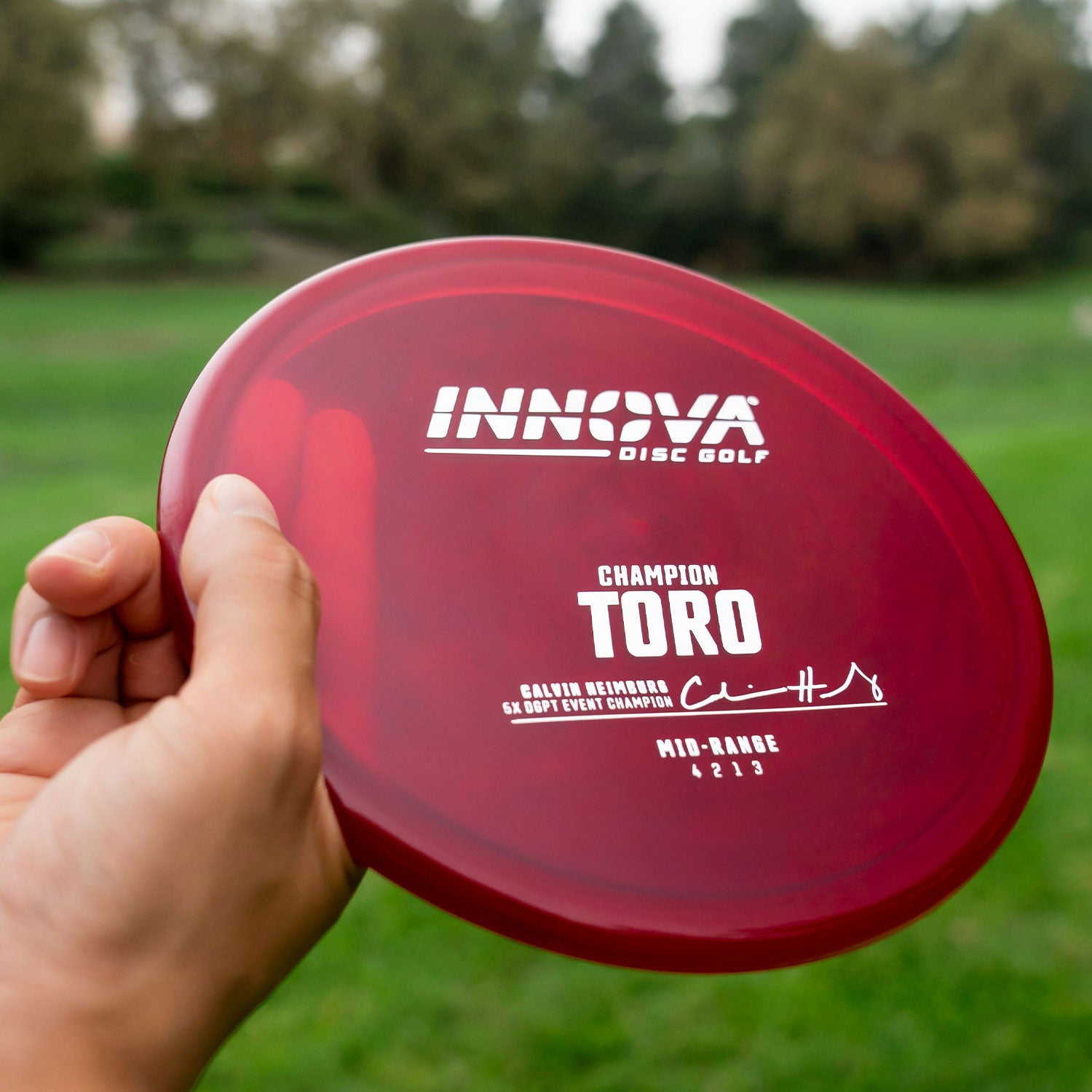 Calvin Heimburg was the inspiration behind the Toro. He wanted a flat-top, overstable, mid-range disc that he could have confidence in—something that could handle his level of forehand torque. After several variations, the Toro was created and named by Calvin.