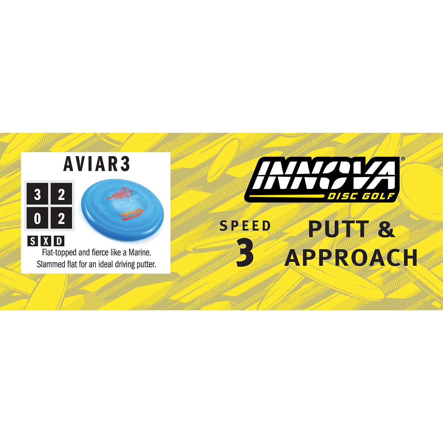 The DX line offers the widest selection of models and weights. These discs are affordably priced and provide an excellent grip in a variety of weather situations. DX discs wear in with usage and over time will eventually take on new and varied flight characteristics. Many top pros carry several DX discs of their favorite models to provide different flight patterns for different situations. Flat-topped and fierce, the Aviar3 is an ideal putter for short drives, aggressive upshots, and windy putts.