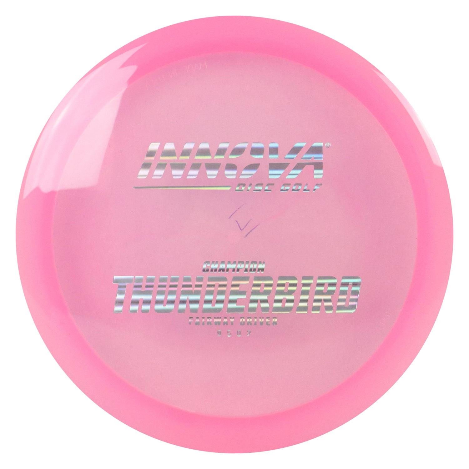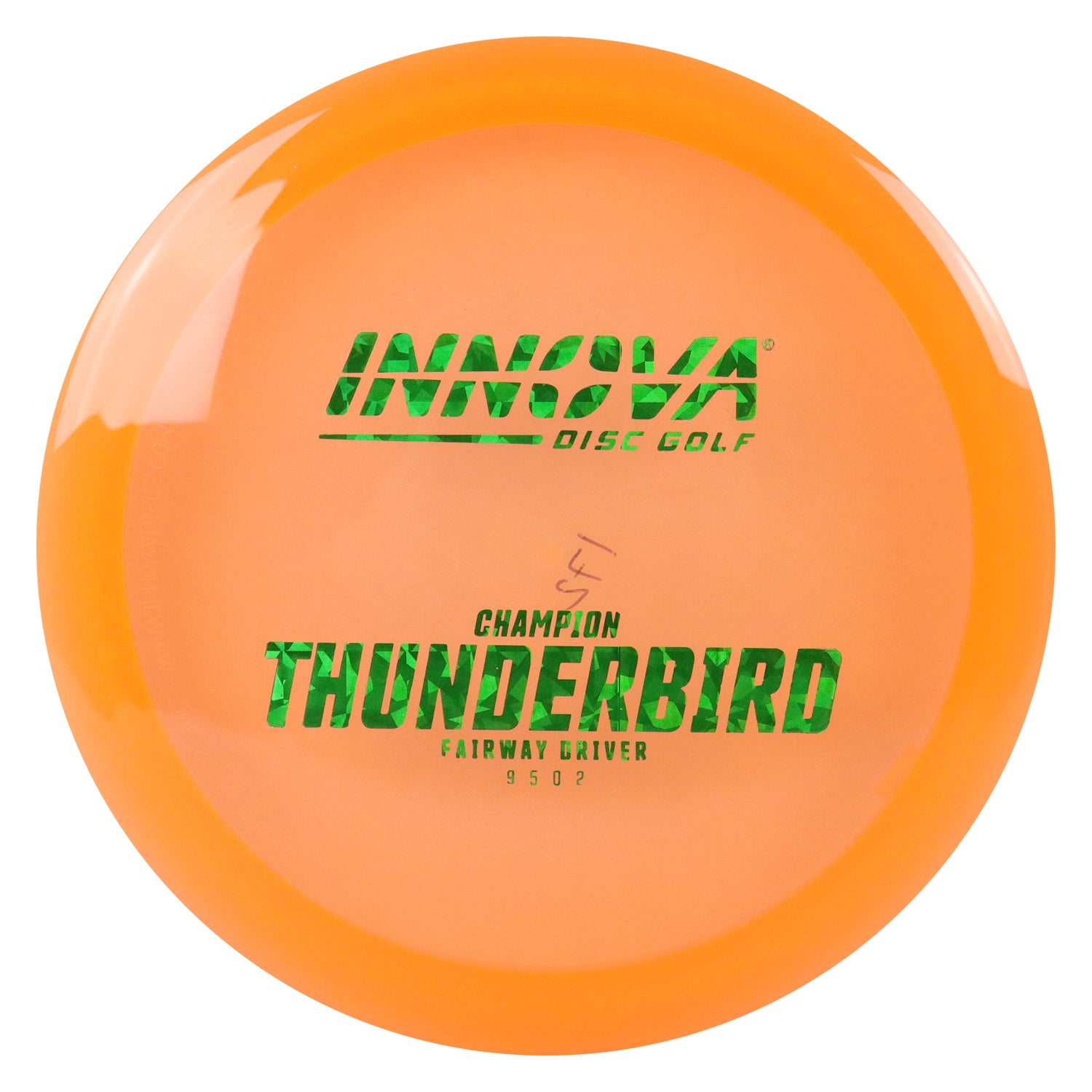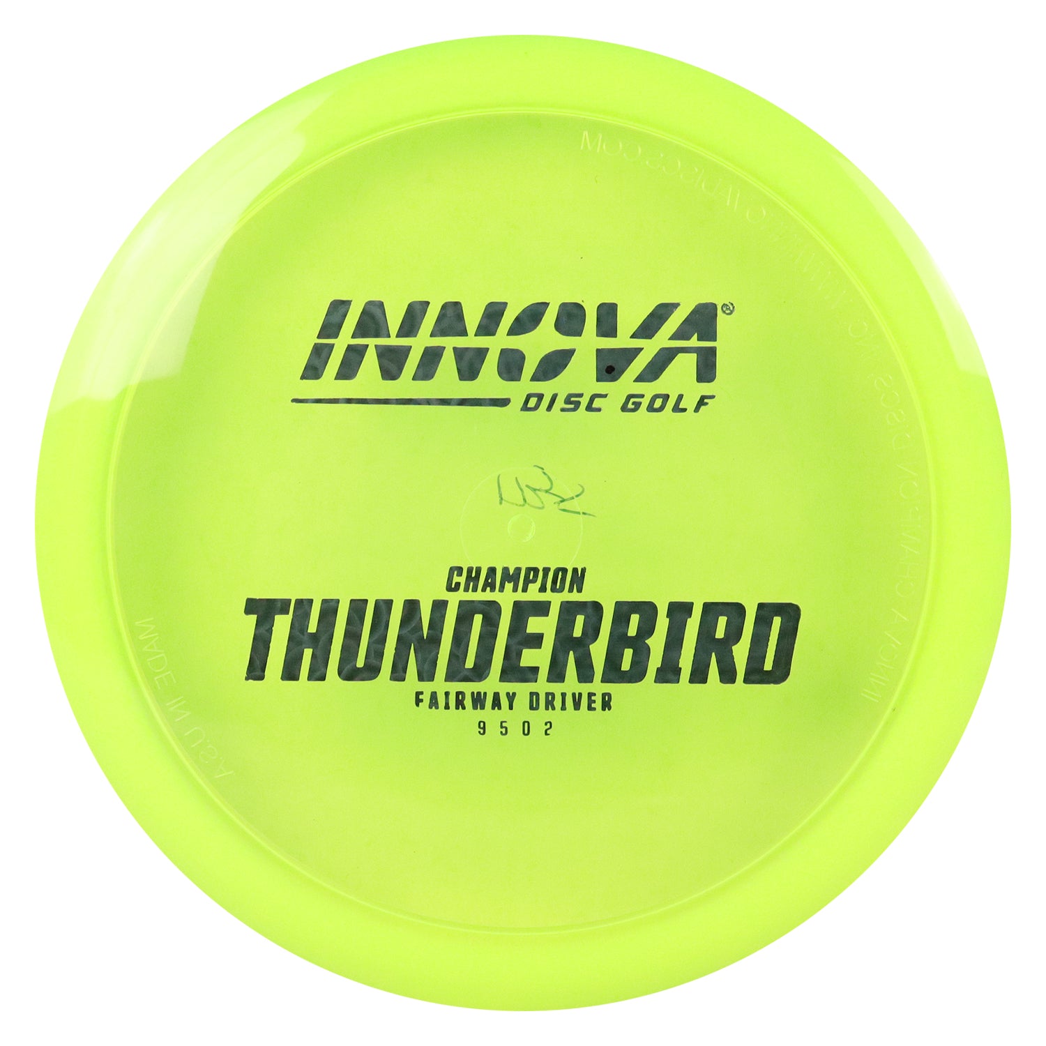 The Thunderbird is speed 9 driver with controllable, accurate flights. It has the stability of a TeeBird with the speed of a Valkyrie The Champion line is produced with a hi-tech plastic that provides outstanding performance and durability. Champion discs are distinguished by a beautiful clear appearance. Designed for professional players, Champion line discs are usually a little firmer and more stable than the same model in other plastics. Whether used in heavily wooded situations, or on extremely rugged courses, our Champion line plastic will continue to perform predictably and avoid damage better than any other plastic.