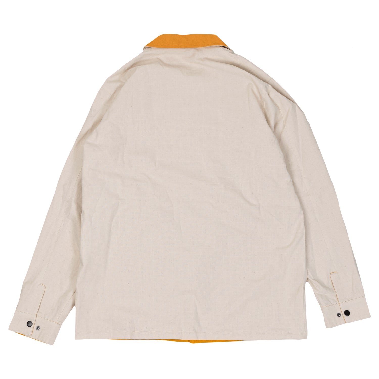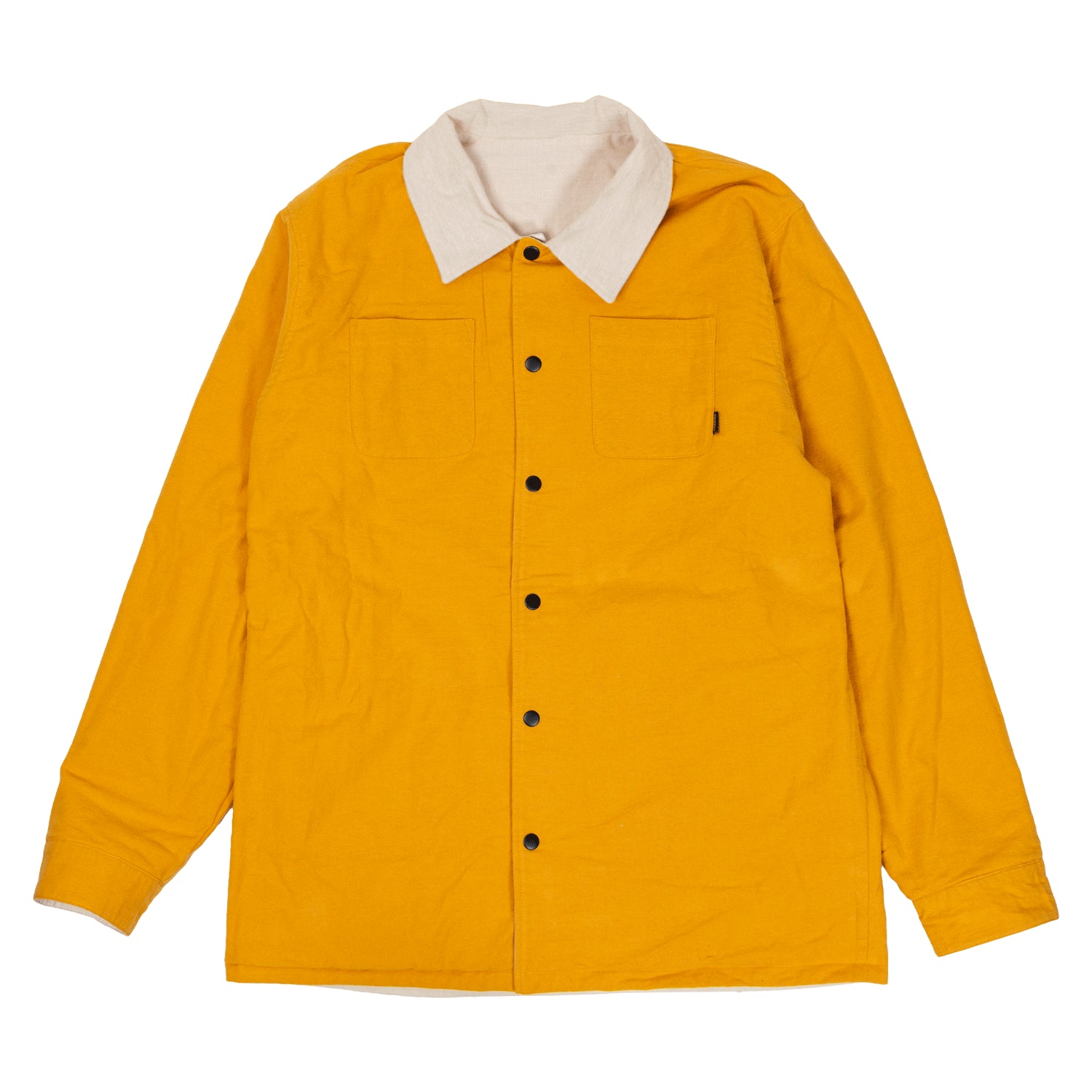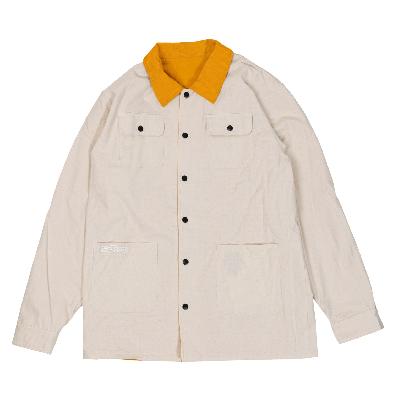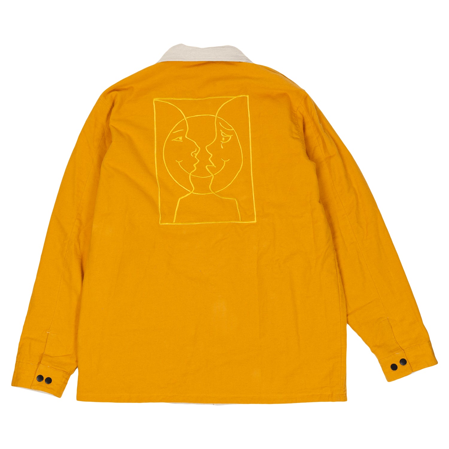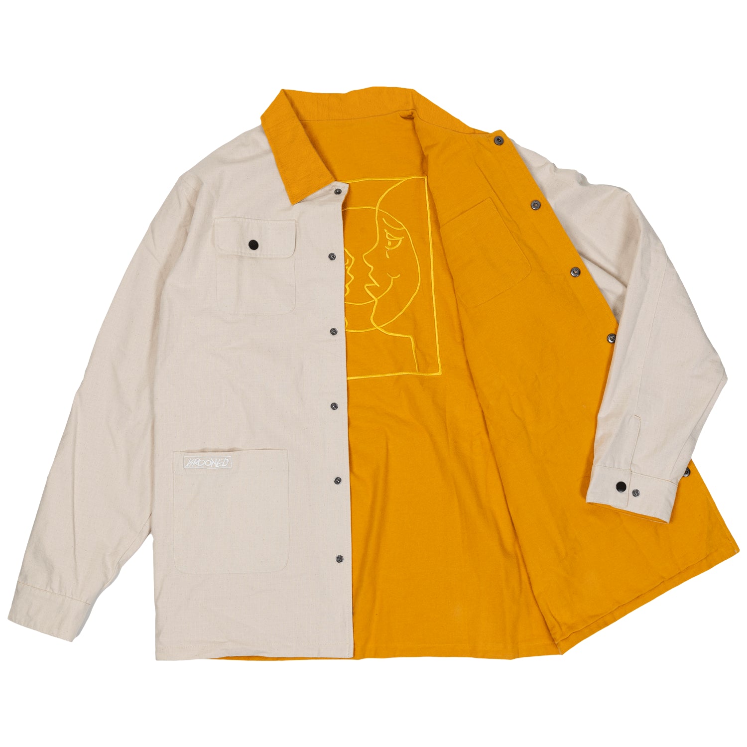 Krooked coat from Deluxe. The Moonsmile Raw Reversible Jacket in Natural/Gold. 100% cotton ripstop flannel reversible button front jacket with patch pockets and custom embroidery.