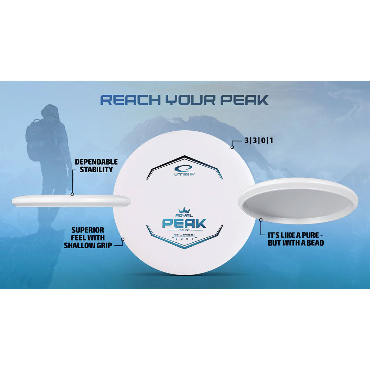 The Peak putter by Latitude 64° combines a low-profile, beaded design with excellent flight stability. Building on the success of the popular Pure, the Peak features a small bead underneath, offering a more refined grip and extra stability. Perfect for putting and precision approaches, the Peak is ideal for players seeking a reliable disc that performs in all conditions.