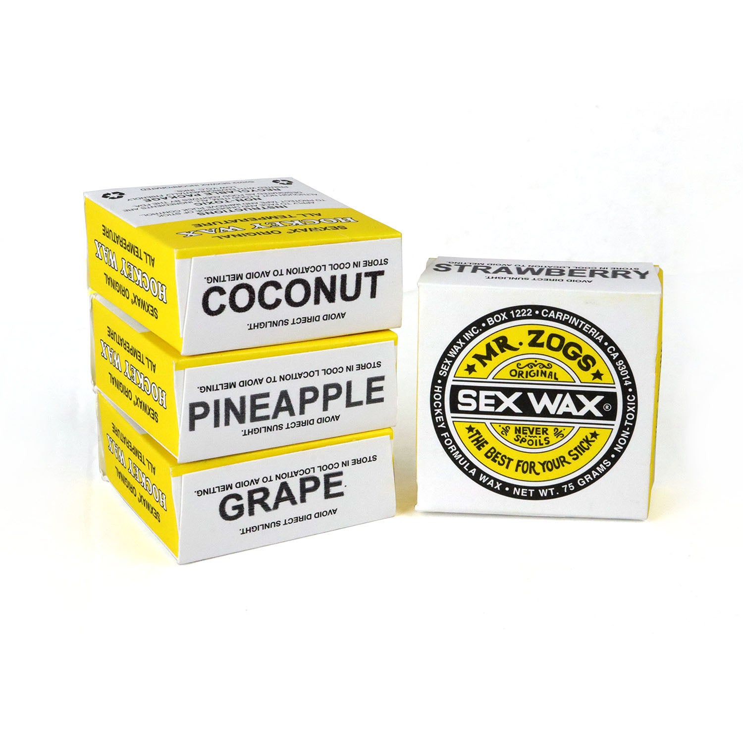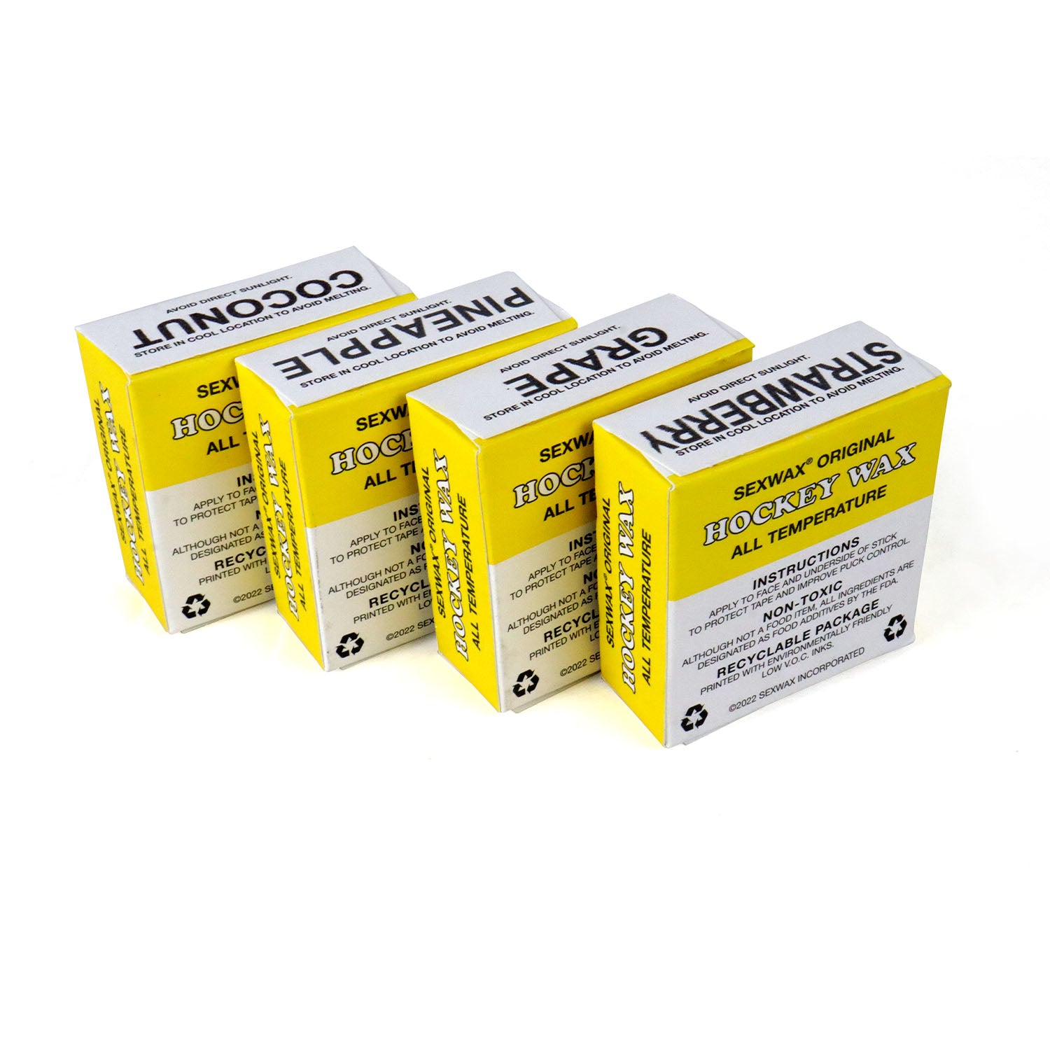 4-Pack includes a variety of colors and scents! Prevent water saturation to tape and enhance puck control with Sexwax Hockey Wax. Wax color denotes fragrance of each bar. This listing includes 1 of each color. Coconut/White, Strawberry/Red, Pineapple/Yellow, and Grape/Purple. Each bar is 75 grams. Apply to face and underside of stick to protect tape and improve puck control. Made in the USA.
