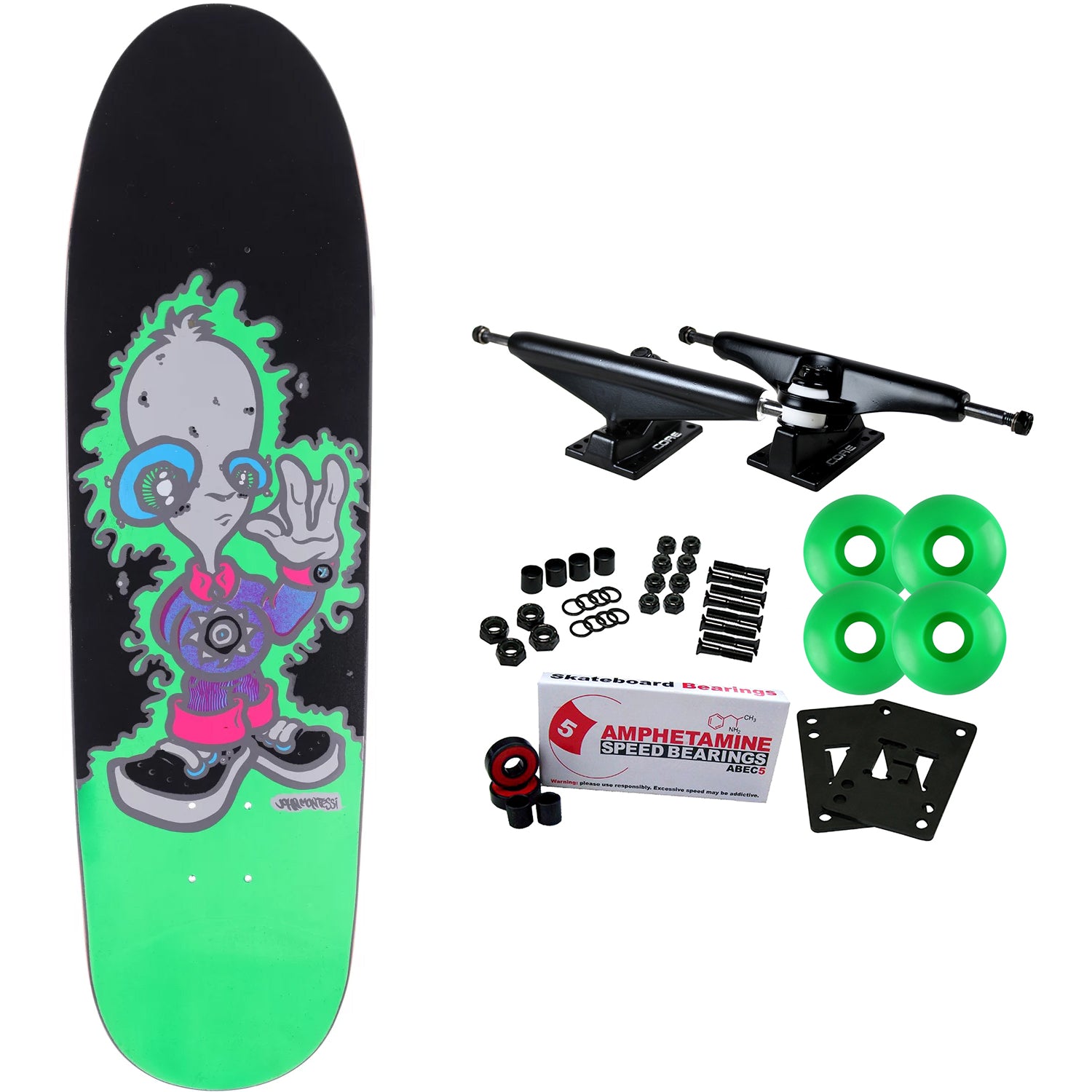 Dwindle presents Screen Printed Re-Issues on premium 7-Ply North American Maple featuring Resin7 Construction. The New Deal Montesi Alien Screen Print Measures 9.0" x 31.8". Comes with Core trucks, 58mm 97A wheels, Amp abec 5 bearings, Black Diamond Griptape, risers, and hardware. Core trucks are light weight and feature heavy duty aluminum with grade 8 steel kingpins and axles, as well as USA made bushings and pivot cups. 58mm 97A are the perfect wheels for both street and park skating. Like the name states, Amp bearings are stimulants for your wheels! Light synthetic oil, Delrin Crowns, and Rubber Serviceable Shields are a few of the things that makes these bearings one of the best Abec 5 rated bearings on the market. Arrives un-assembled which allows for customization and a feeling of accomplishment. Skaters love building their boards! Easy to assemble!