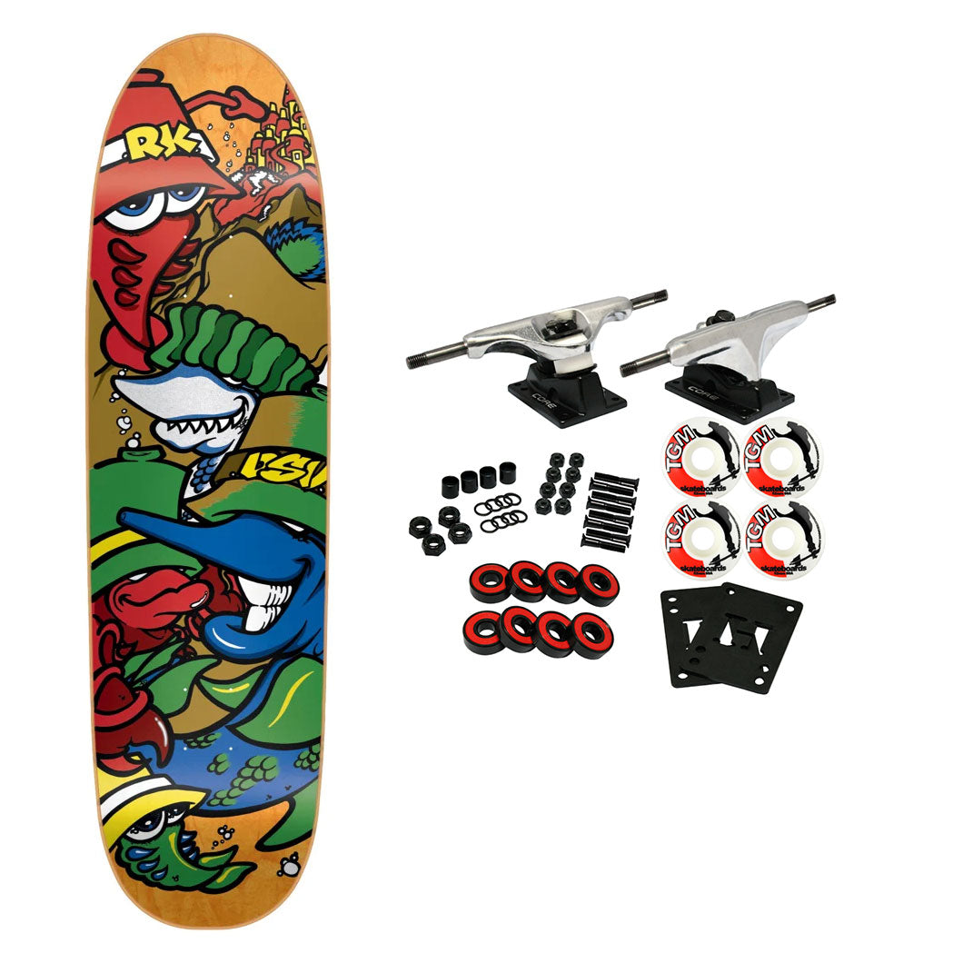 Resin 7 Construction, Hand Screen Printed. 7-ply 100% North America Maple with Epoxy Resin Glue. Individually Pressed. Measures 8.6" x 31.8", 14" WB. Comes with Core trucks, 52mm TGM logo wheels, Amp abec 5 bearings, Black Diamond Griptape, risers, and hardware. Core trucks are light weight and feature heavy duty aluminum with grade 8 steel kingpins and axles, as well as USA made bushings and pivot cups. 52mm 99A are the perfect wheels for both street and park skating. Like the name states, Amp bearings are stimulants for your wheels! Light synthetic oil, Delrin Crowns, and Rubber Serviceable Shields are a few of the things that makes these bearings one of the best Abec 5 rated bearings on the market. Arrives un-assembled which allows for customization and a feeling of accomplishment. Skaters love building their boards! Easy to assemble!